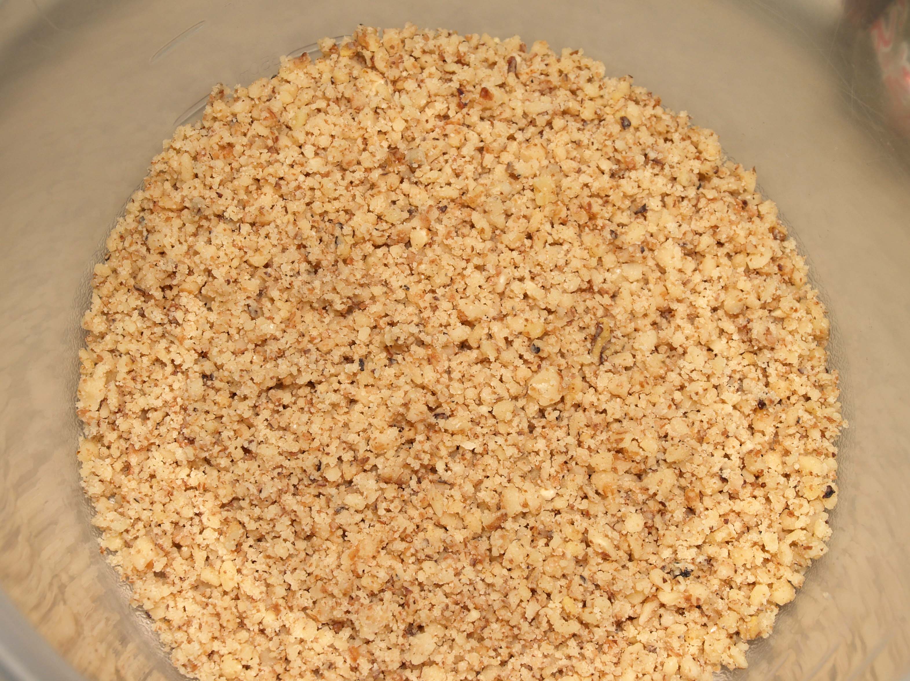 Begin by placing the walnuts in the food processor and processing until you have large crumbs (think cookie crumbs). Place the ground nuts in a medium mixing bowl and set aside.