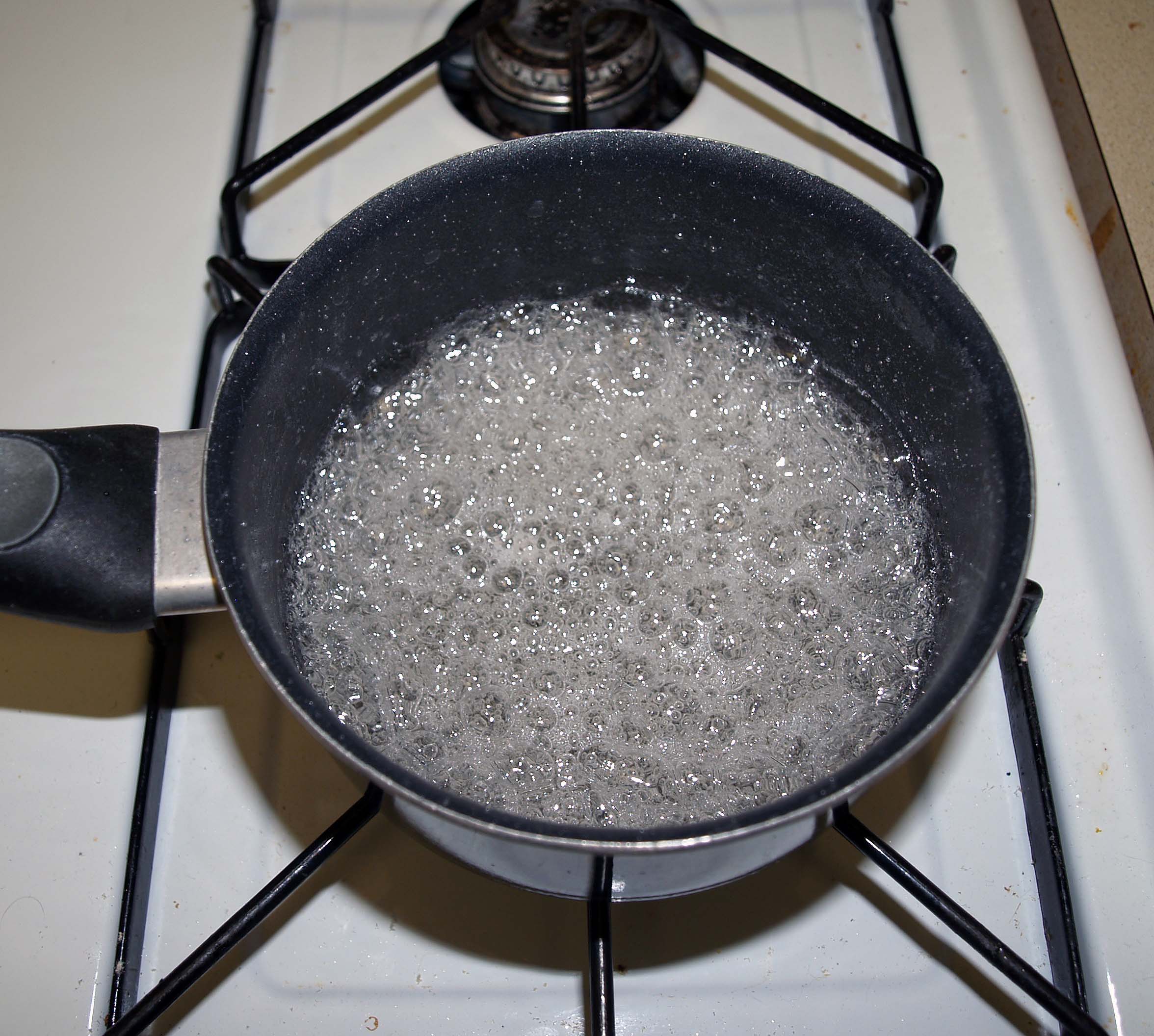 Next, place equal parts water and granulated sugar in a small saucepan. For the task at hand, I used 1/2 cup of each to infuse with 6 sprigs of mint. Stir the water and sugar together and bring to a boil over medium-high heat. Allow the mixture to boil for 5 minutes. DO NOT stir. If you do, the sugar may crystallize on the side of the pan and burn.