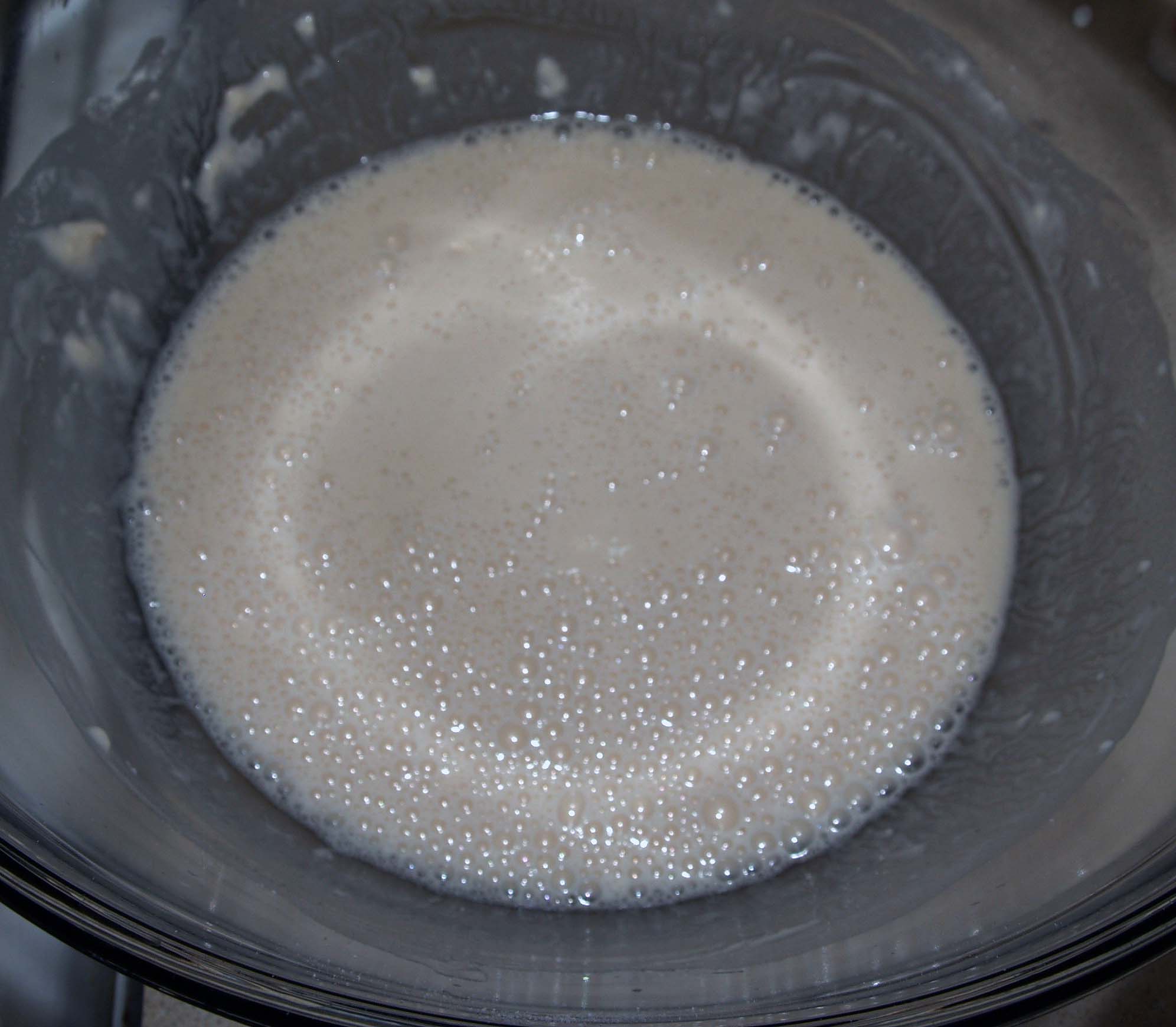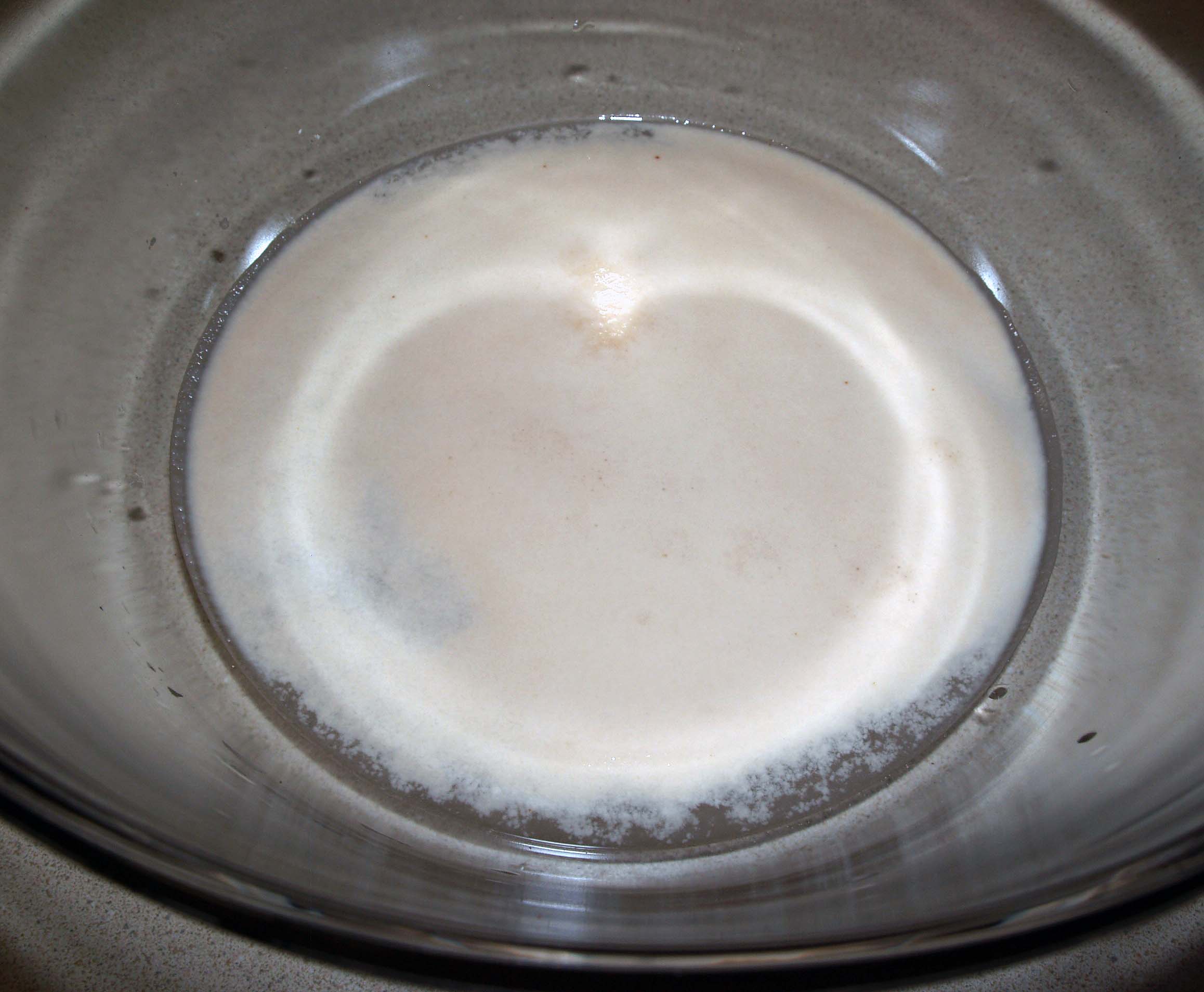 First, pour your warm water in a large mixing bowl and whisk in the sugar until it is completely dissolved. Pour the yeast on top and let it sit for approximately 5 minutes until it looks creamy.