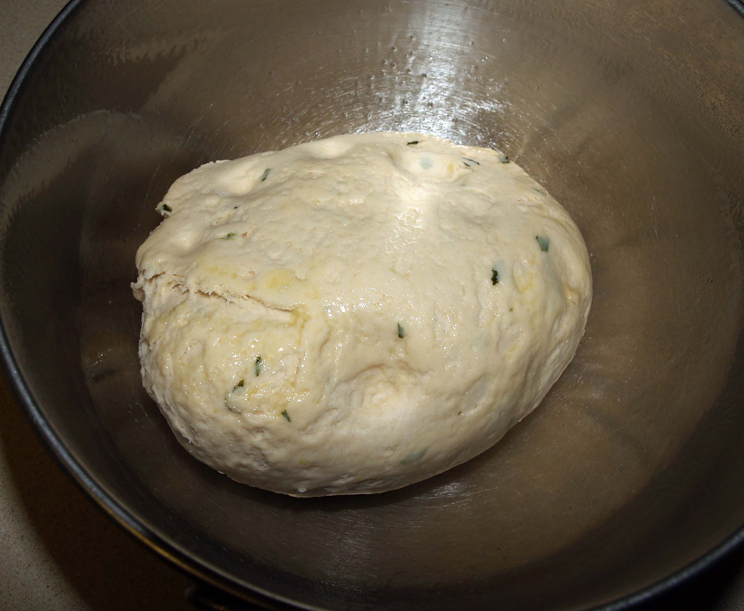 Shape the dough into a ball and put it in a greased bowl. Flip it over once to coat both sides. Cover the bowl with a towel and let the dough rise until it doubles in size, approximately 60-90 minutes.