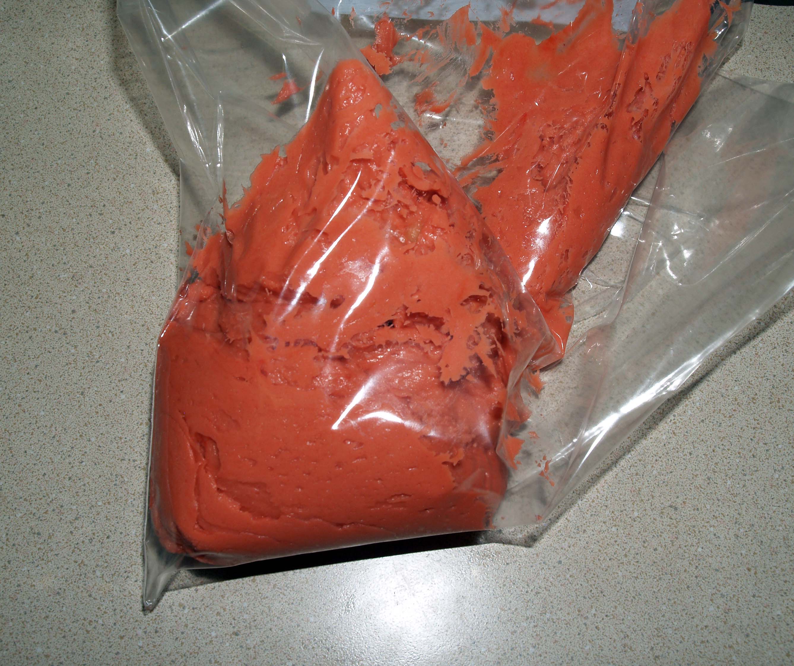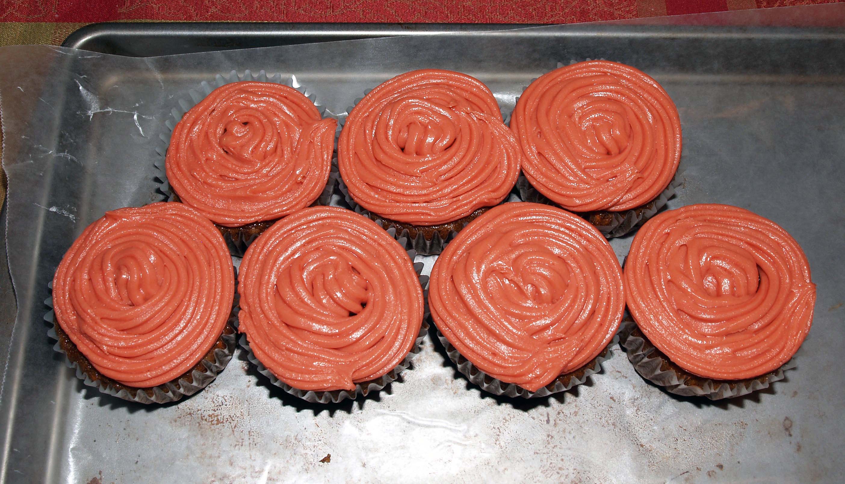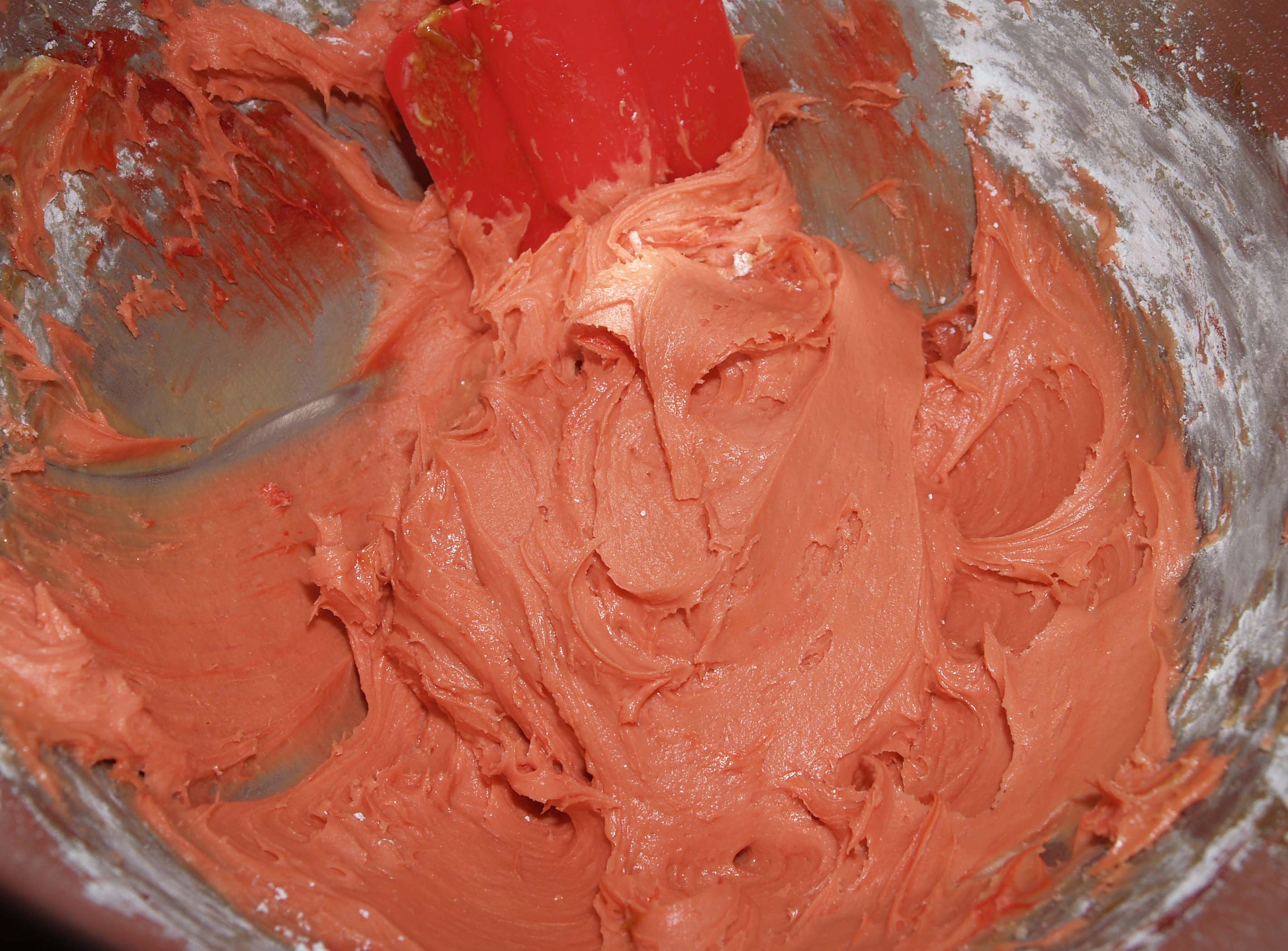 Take note that the gel food coloring is really essential here. The molasses turned the frosting brown, as you will see in the photos, so it took extra dye to compensate. Adding too much liquid food coloring can affect consistency and taste, but you don’t need as much gel coloring to get the same results. I probably could have used more to get a deeper rose red, but I happened to like the color I made, so I stuck with it.