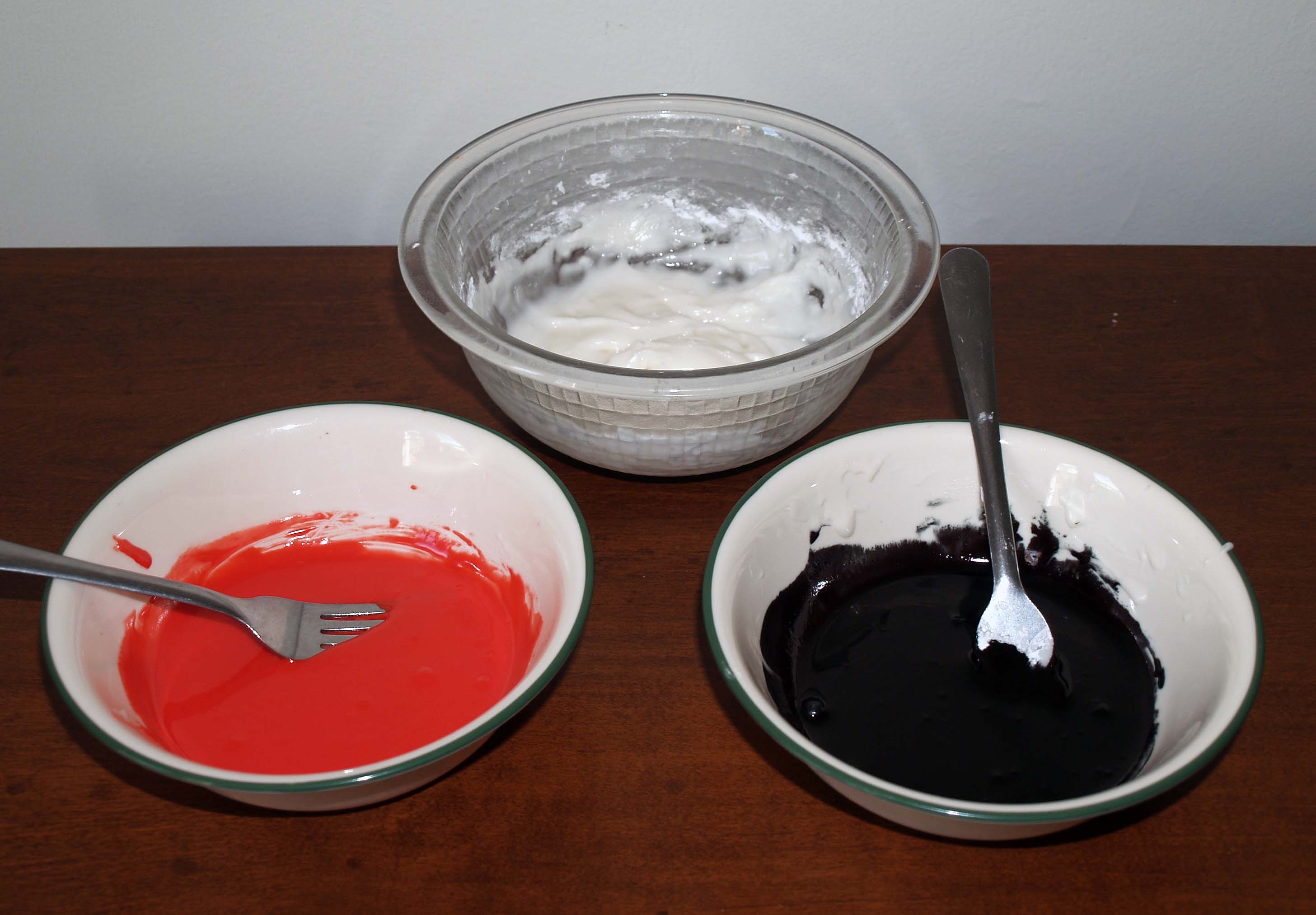 When you are satisfied with the consistency of your icing, add food coloring until you achieve the desired colors. I used Wilton black icing gel coloring for the black. It doesn’t taste good on its own, but for the amount I used in the icing, I didn’t taste a difference. A word of warning: this food coloring will dye everything it touches midnight blue. Keep this in mind if you are “sampling” your frosting shortly before you plan to interact with people (unless black tongue is the look you’re going for).
