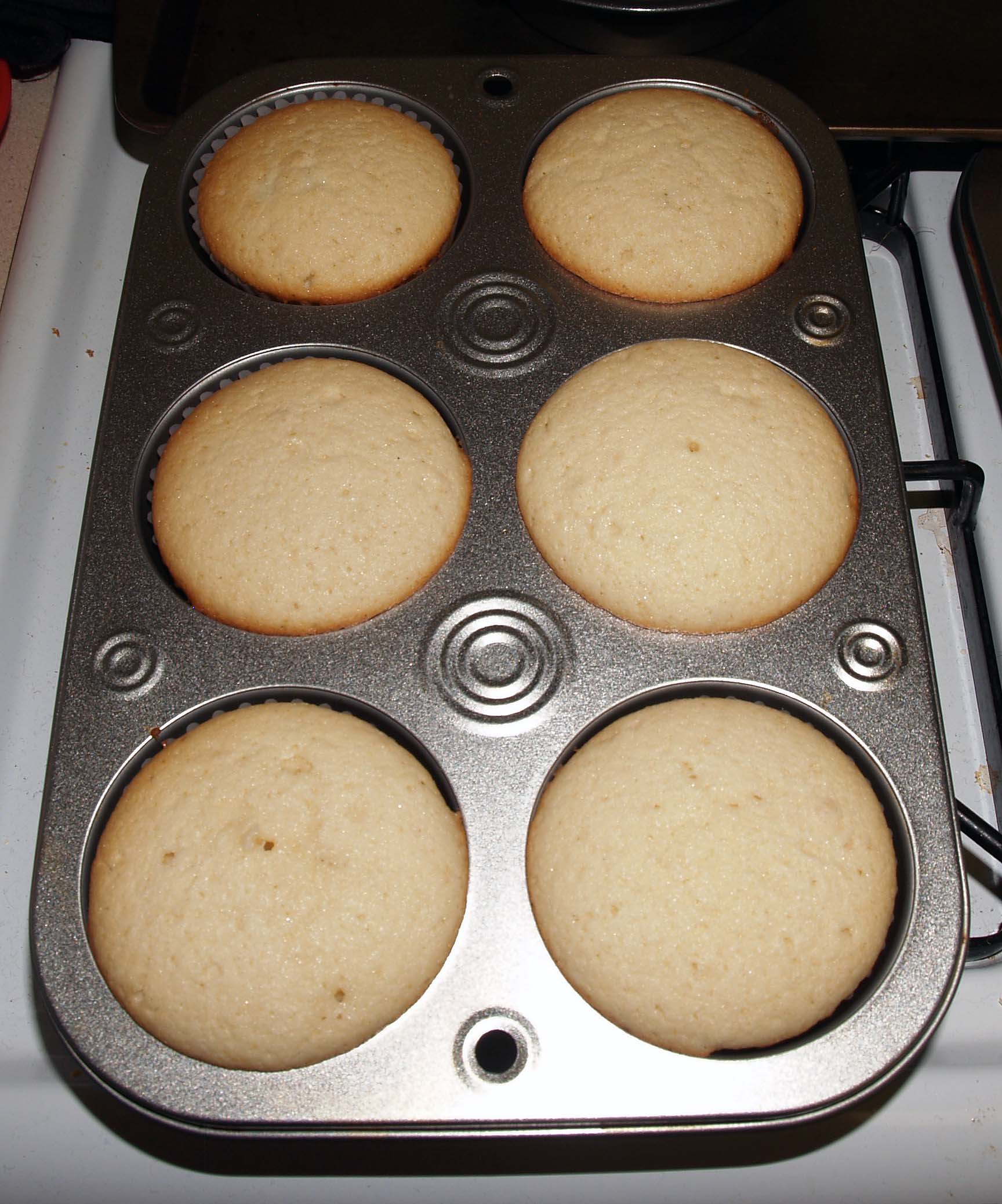 Divide the batter between the cupcake wrappers or cake pans. I used an ice cream scoop, and it was really helpful. It delivers the same amount of batter every time, and it has a handy rotating arm on the inside to help scrape the batter off the spoon part.