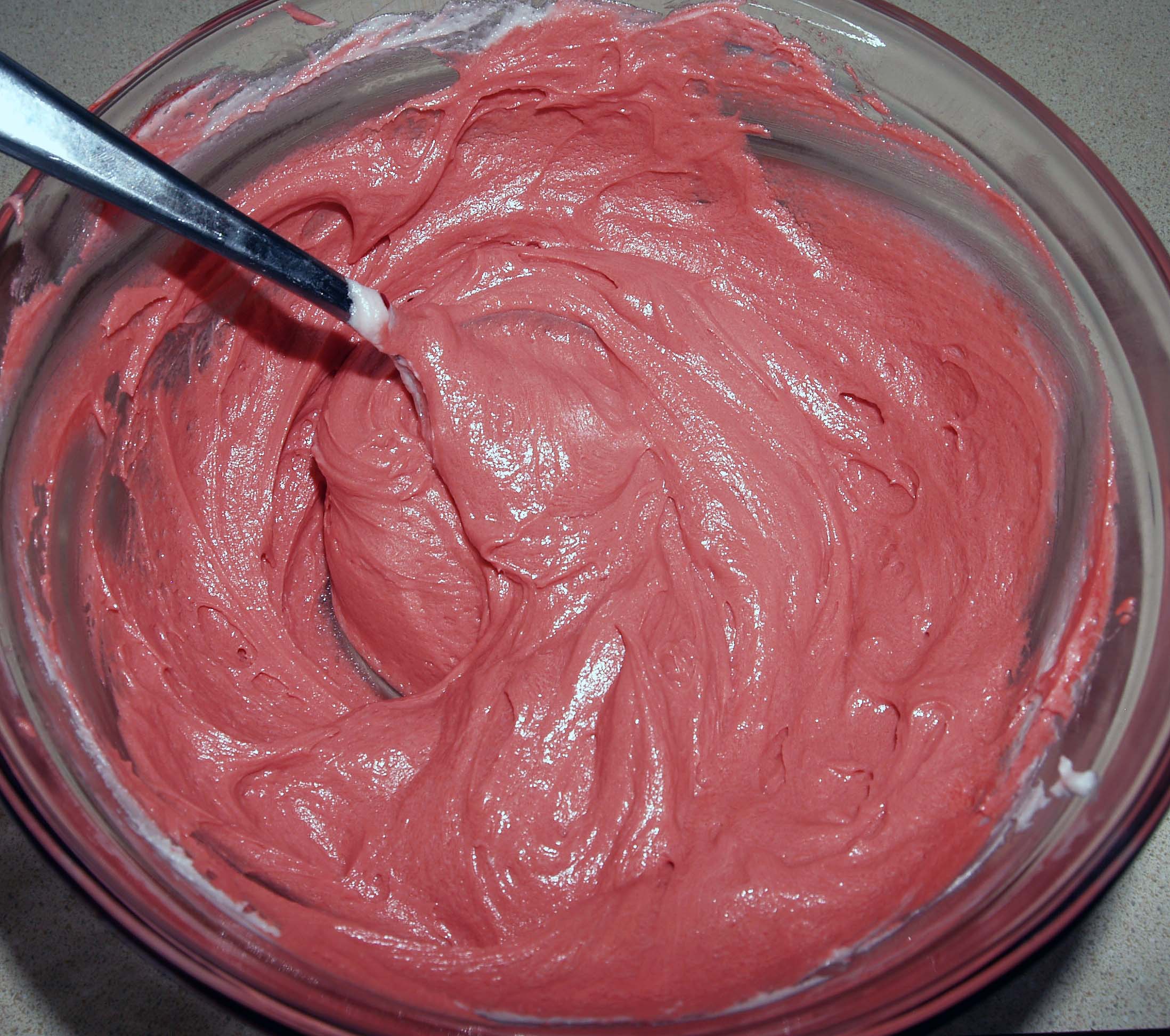 Now divide and tint your frosting appropriately. I added almost half a tube of red gel food coloring and a drop of black to achieve the color you see here.