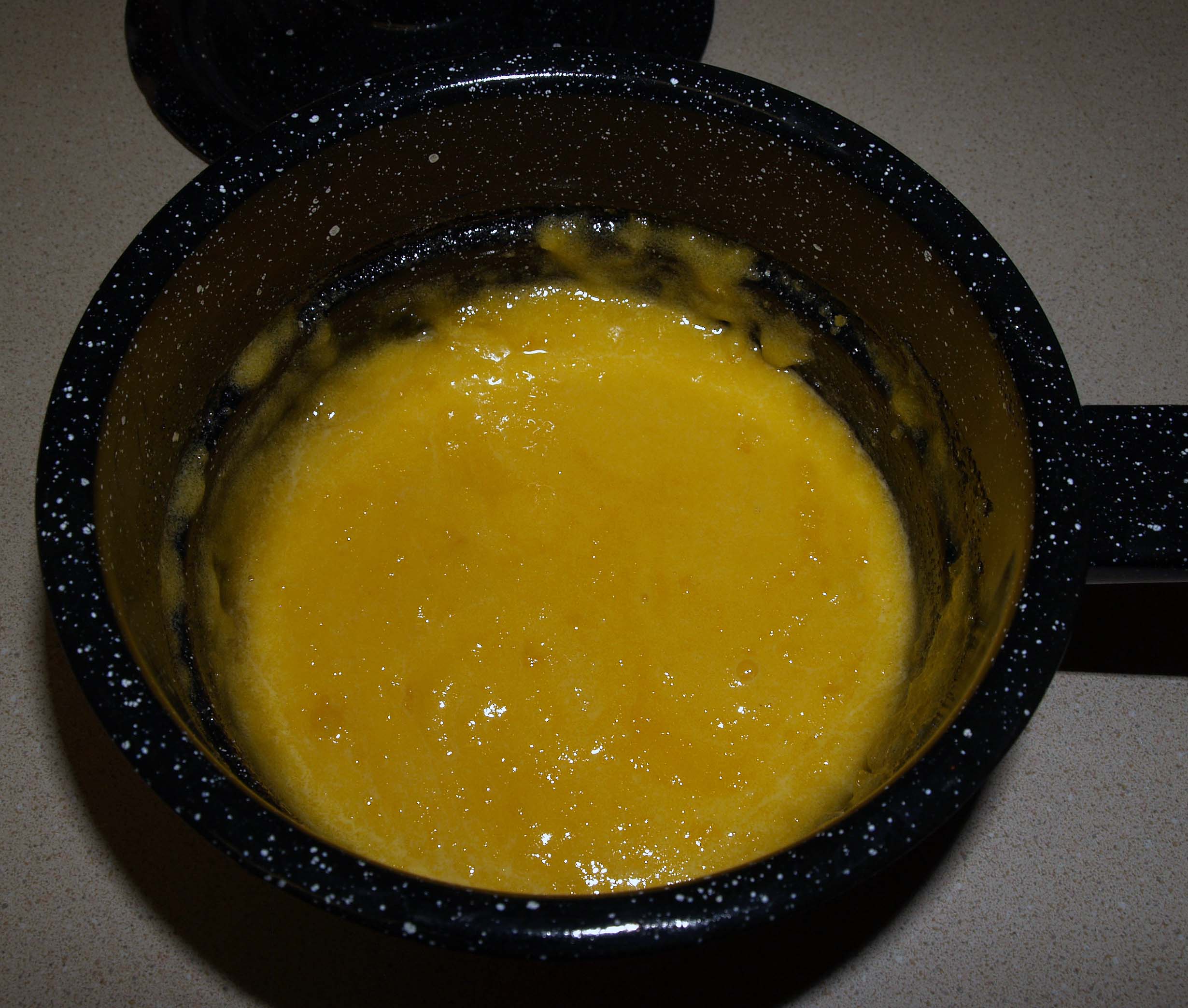 Put 1″ of water in the bottom of the double boiler and bring to a boil. Reduce it to a simmer and put the top part on. While you should whisk your curd constantly while it cooks, it won’t be the end of the world if you have to step away temporarily.