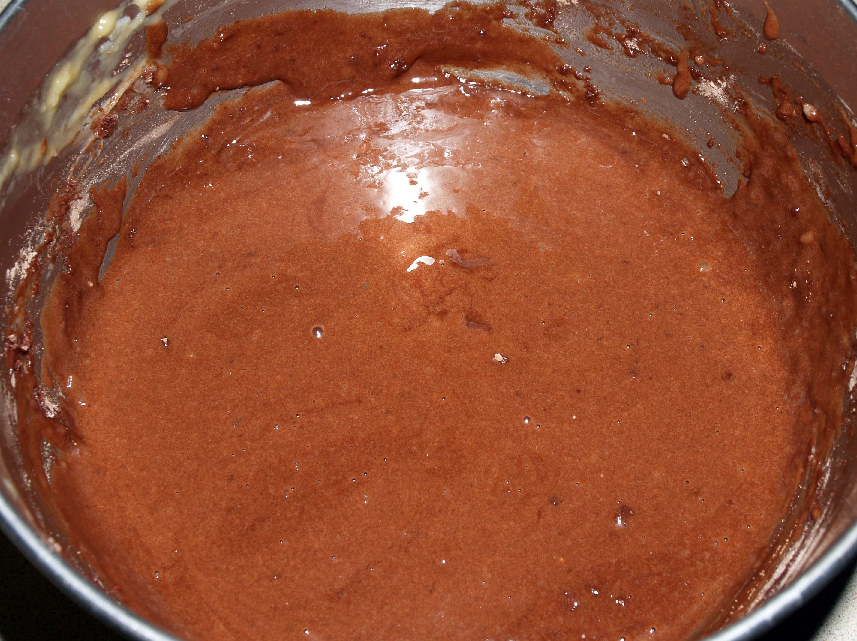 In a separate bowl, whisk together the flour, cocoa powder, baking powder, and salt. Add the dry ingredients to the wet ingredients and stir until the mixture is combined (again, there will be some small lumps).