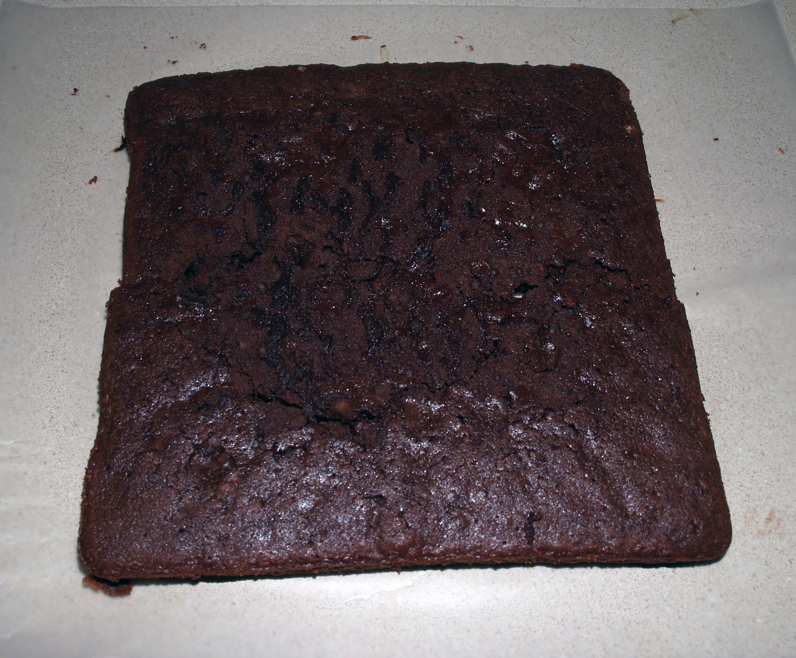 If you’re flipping again, be careful, because you can lose your brownie this way. I would put a piece of waxed paper on top of the brownie, then put a cooling rack on top of that upside down. I will admit that I thought I could do it with just the waxed paper, and I was sorely mistaken. My brownie cracked in half and ended up all over the counter. I picked it up and shoved the two halves together, and it worked out ok.