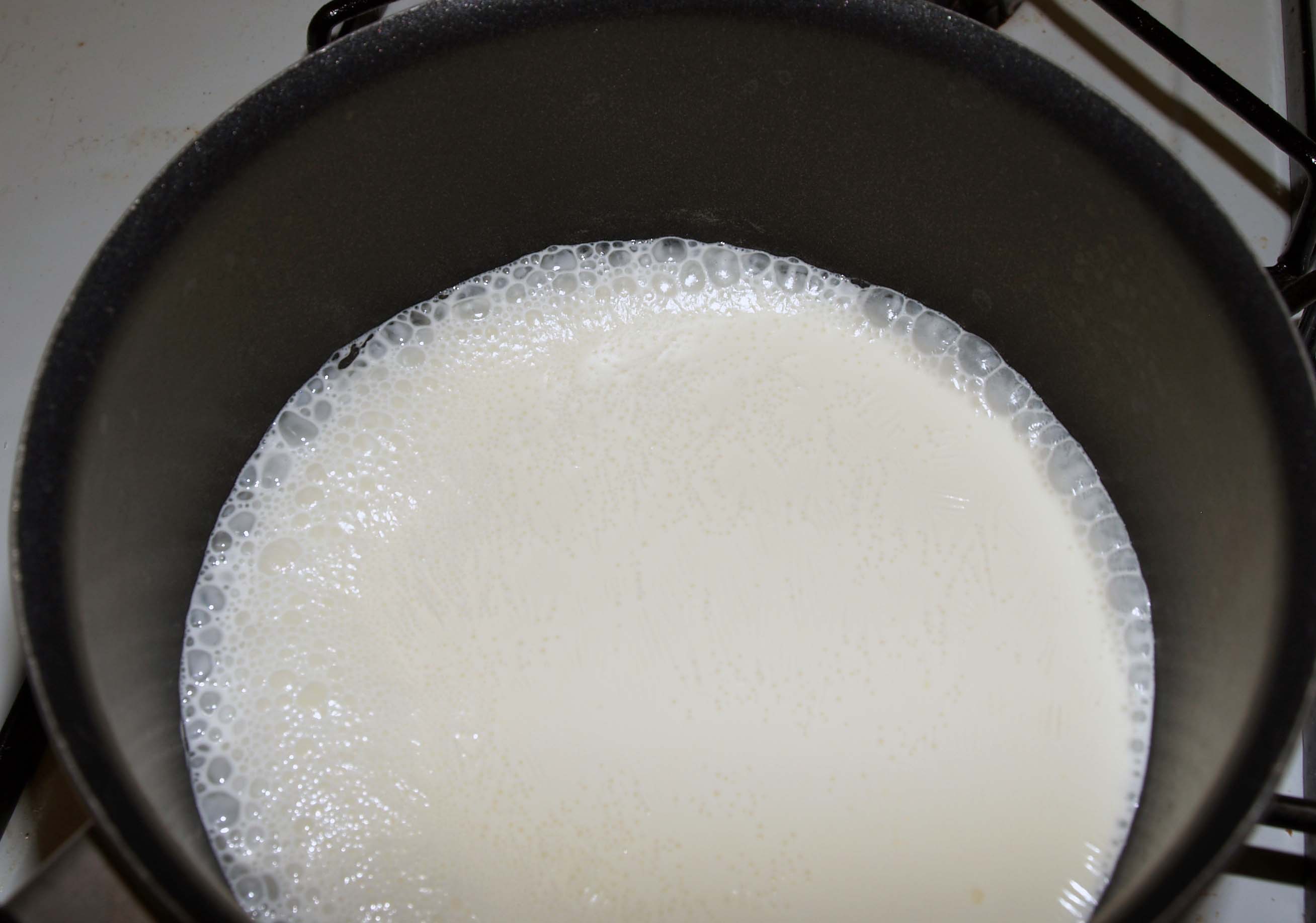 Fortunately, we’re going to cover this in ganache, so you can hide your mistakes if they do happen. While your brownie is cooling (hopefully in one piece), chop your dark chocolate (if you’re not into dark chocolate, you can substitute milk or semi-sweet, or possibly white). Put it in a glass bowl or measuring cup. Put the heavy cream in a small saucepan and bring just to a boil over medium-low heat. When you see the edges start to bubble, remove the cream from the heat immediately. I would have liked to take mine off a few seconds sooner than you see here, but I had to get a photo for you.