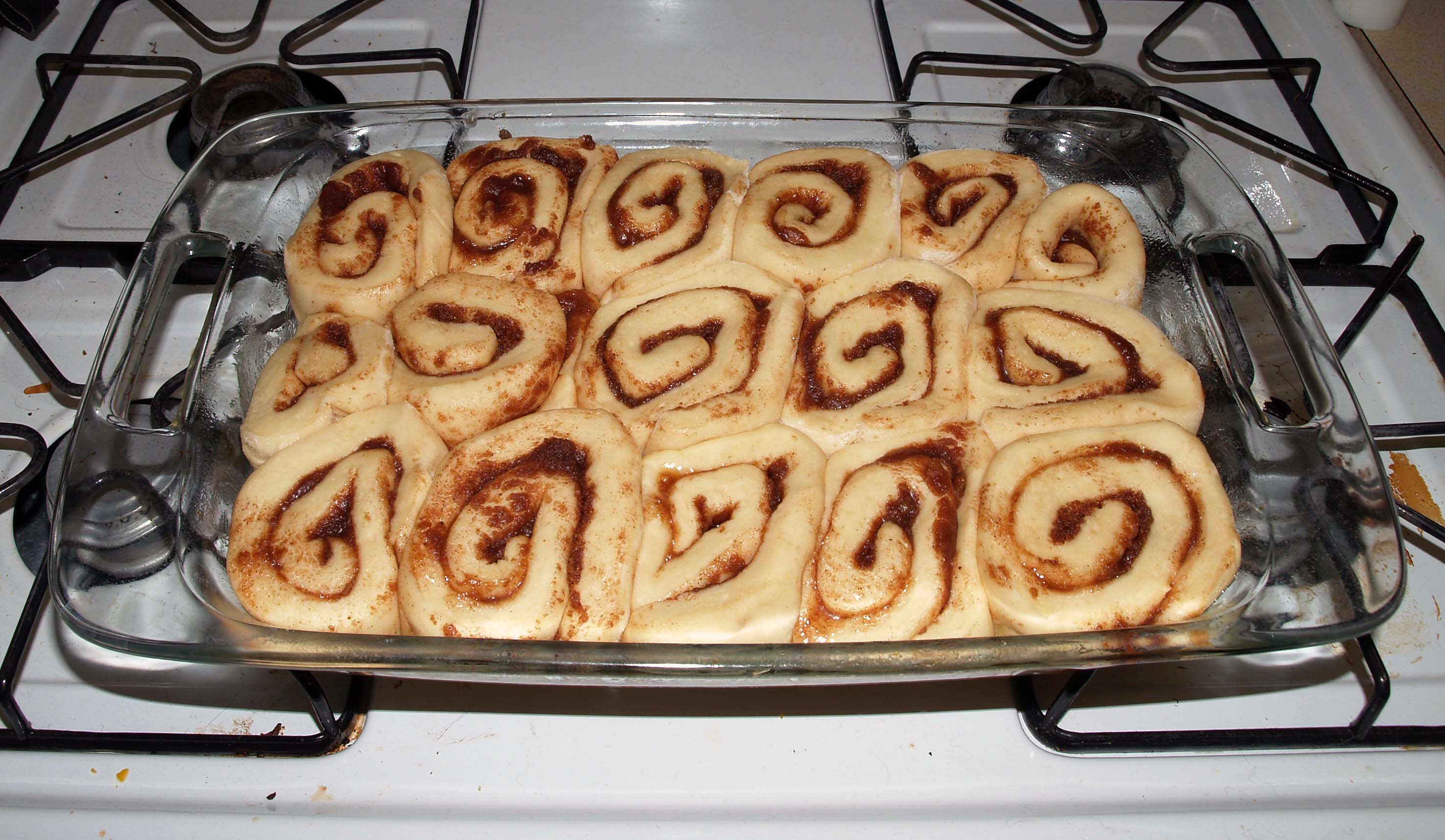 Grease a 9″ by 13″ baking pan (it should have sides at least 2″ tall). Starting from the long side, roll the dough rectangle into a log. It doesn’t have to be perfectly tight.