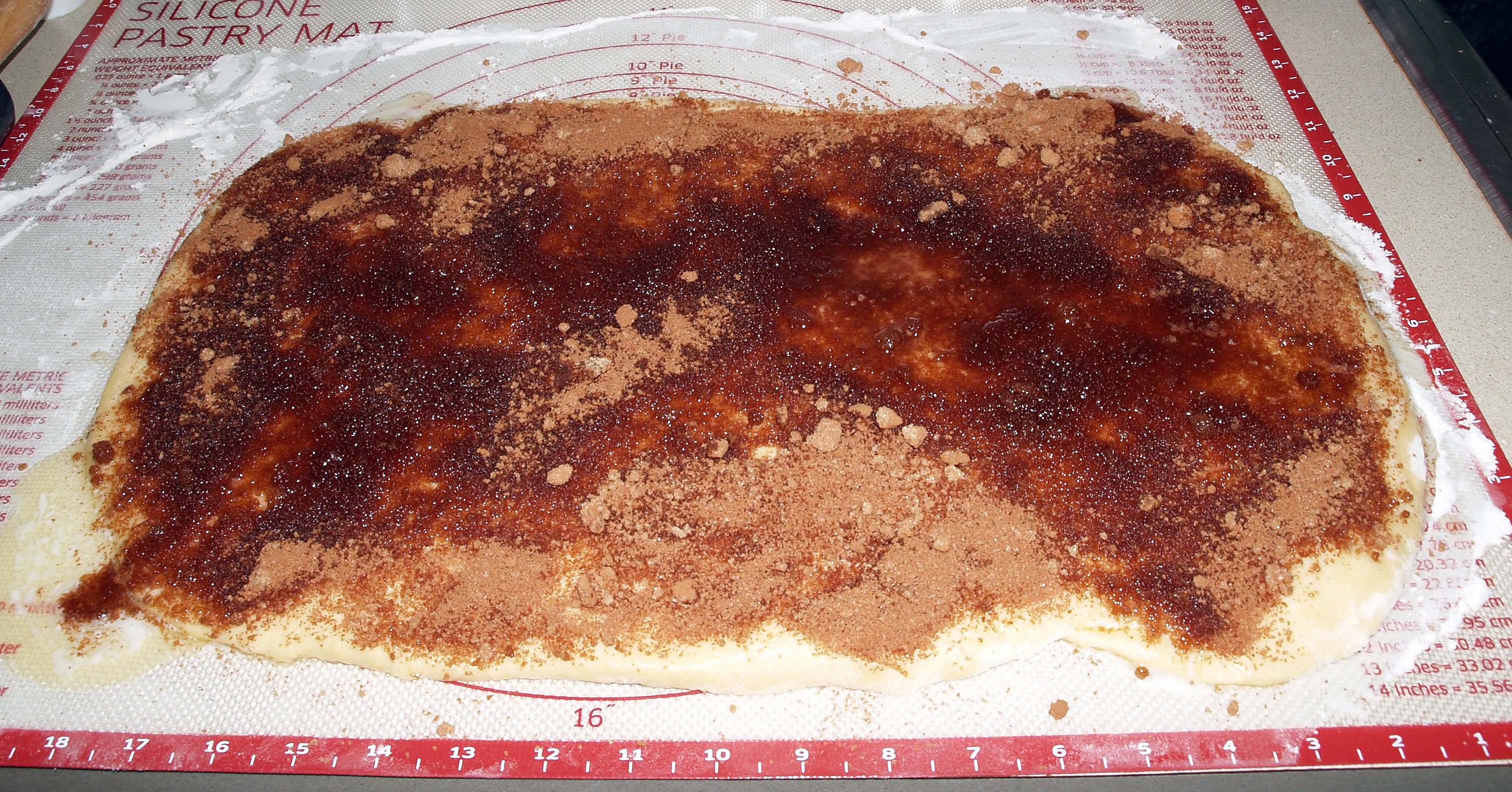 Sprinkle the brown sugar and cinnamon as evenly as possible across the dough. If you have butter leaking off the dough, put the sugar there first to stop the flow.