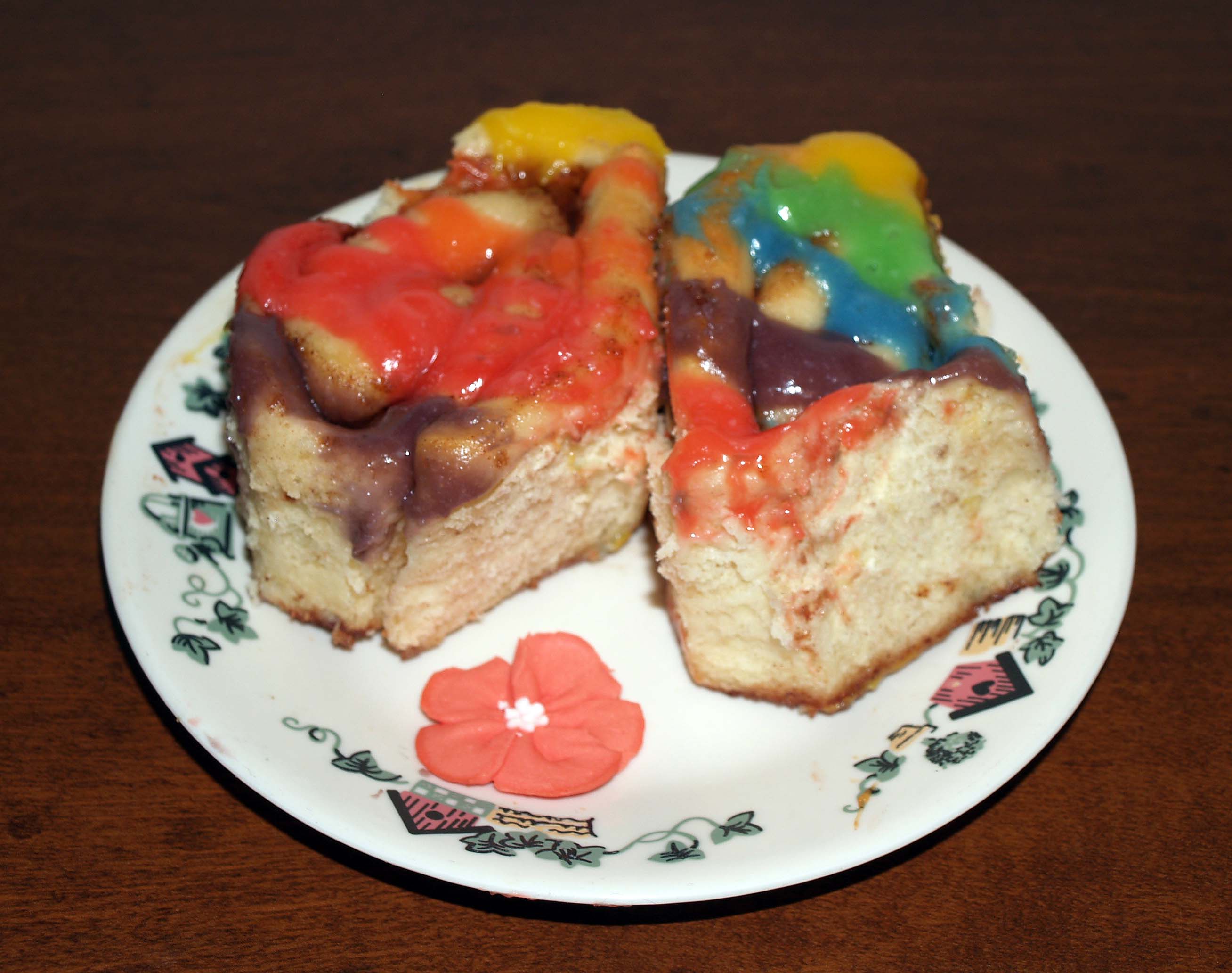 Cut 1/4″ off the corner of the red bag and squeeze the icing in diagonal stripes across your cinnamon rolls. Repeat with the rest of the colors until you have none left and there is a glorious rainbow of deliciousness daring you to eat it.