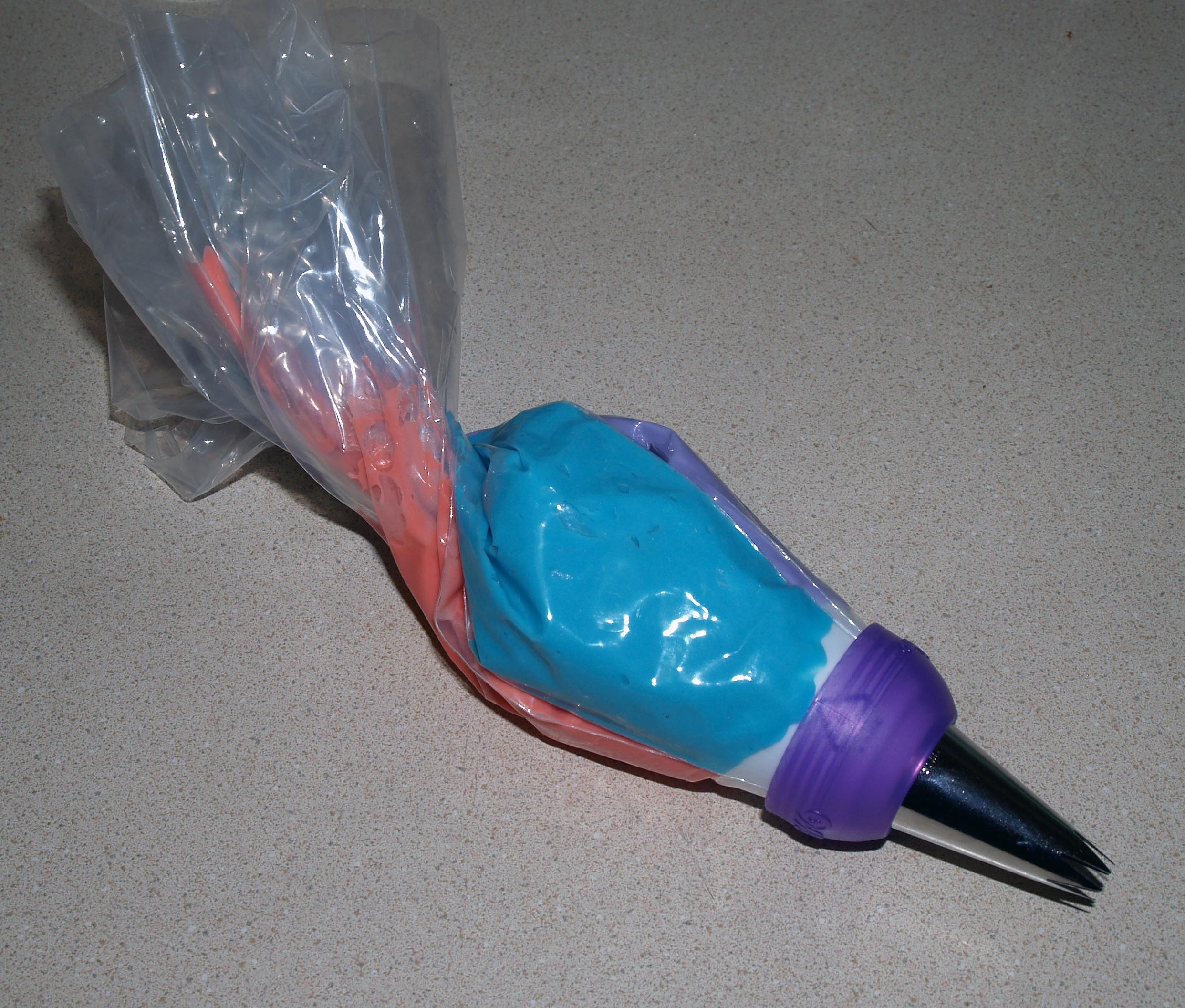 The kit contains the interlocking coupler, six 16″ disposable piping bags, and two large Wilton tips (1M and 1A). This means that you have enough supplies to try this twice, since each color of frosting goes in a different bag. The list price is $7.99, so I got the whole thing for $5.59 plus tax. A regular large coupler is $1.99, each tip is $1.49, and a pack of 12 of the same bags is $5.49, for a grand total of $7.72 (if you were only buying half a package of decorating bags) before discount, so the convenience cost is nominal. The coupler is, of course, larger than standard, but it’s really not large enough to take up all that much space.