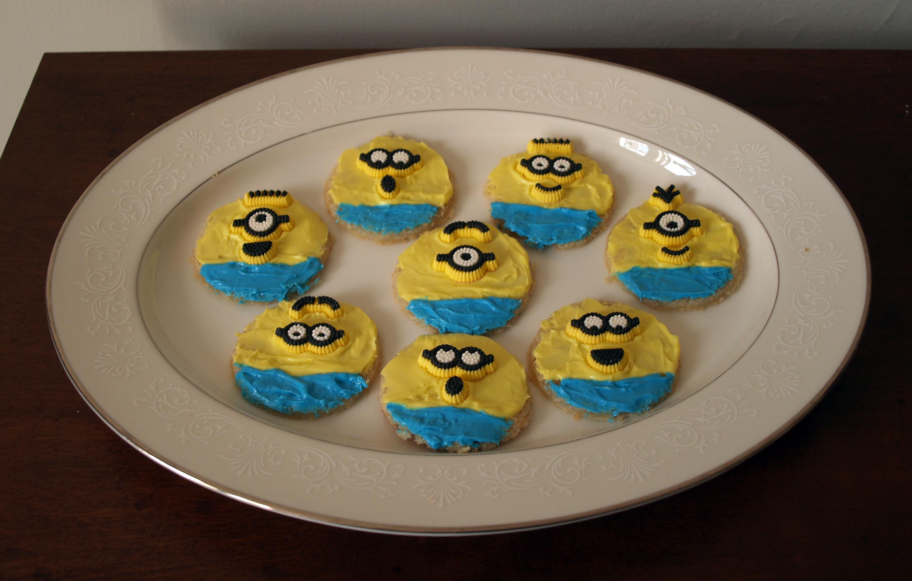 I do realize that it may be difficult to find these Minion sugar decorations, particularly since the movie is now out of theaters. If you can’t find them, I suggest using sugar eyes instead (you should be able to find these at craft stores with baking sections and even in Target). You can use black licorice to make the hair, mouths, and outlines. If that seems like too much trouble, you could also just use white and black frosting to pipe the faces on. This will take a little longer than the procedure I’m documenting here, but realistically it’s still going to be a relatively quick project for the cute payload.