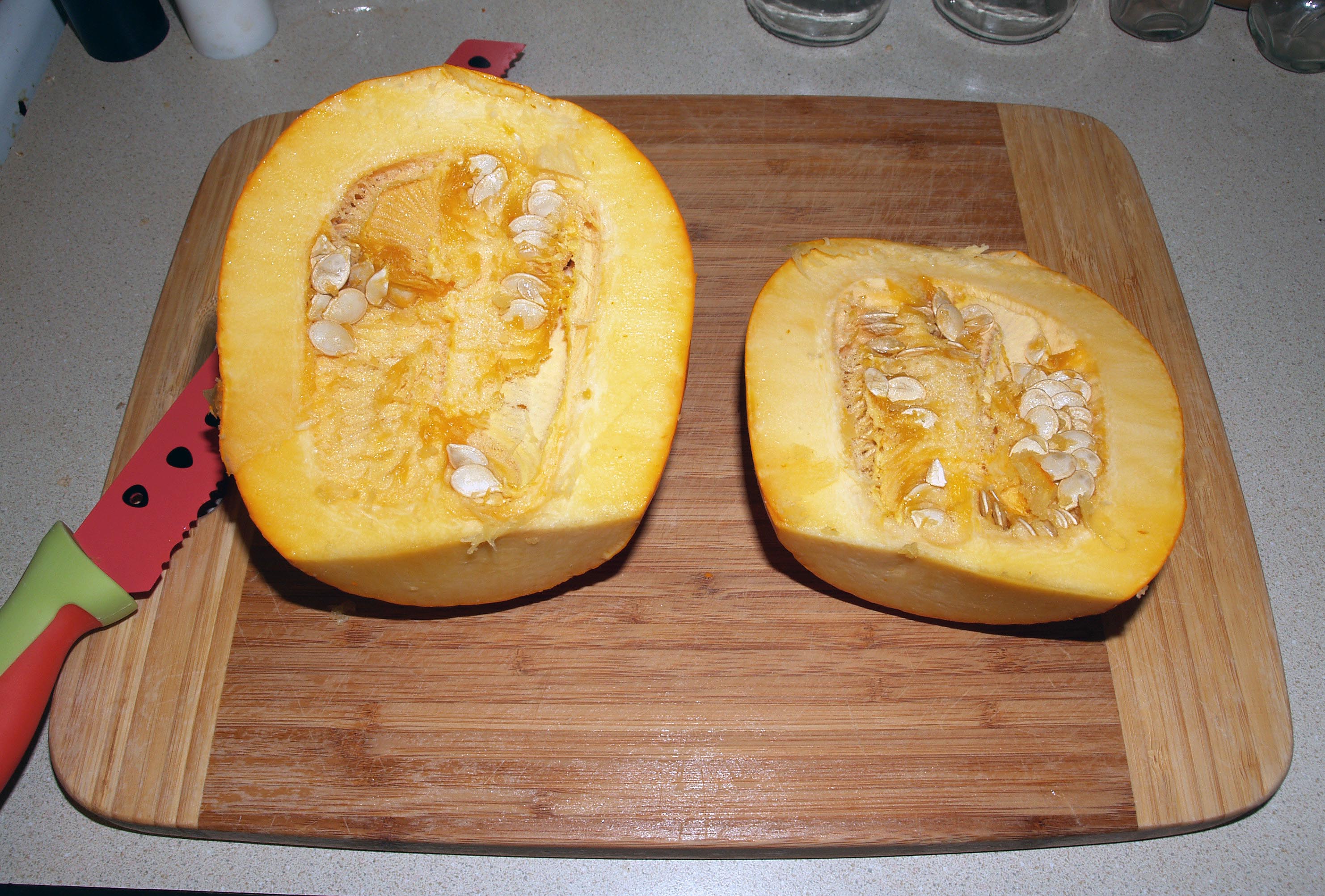 Preheat your oven to 250°F. If you’re carving a jack-o-lantern, cut a hole around the stem as normal. If you’re using a pie pumpkin, there’s no need for that kind of care for the structure of the pumpkin, so you can just cut off the top and cut it in half (I used a watermelon knife for this, but any large, serrated knife will do).