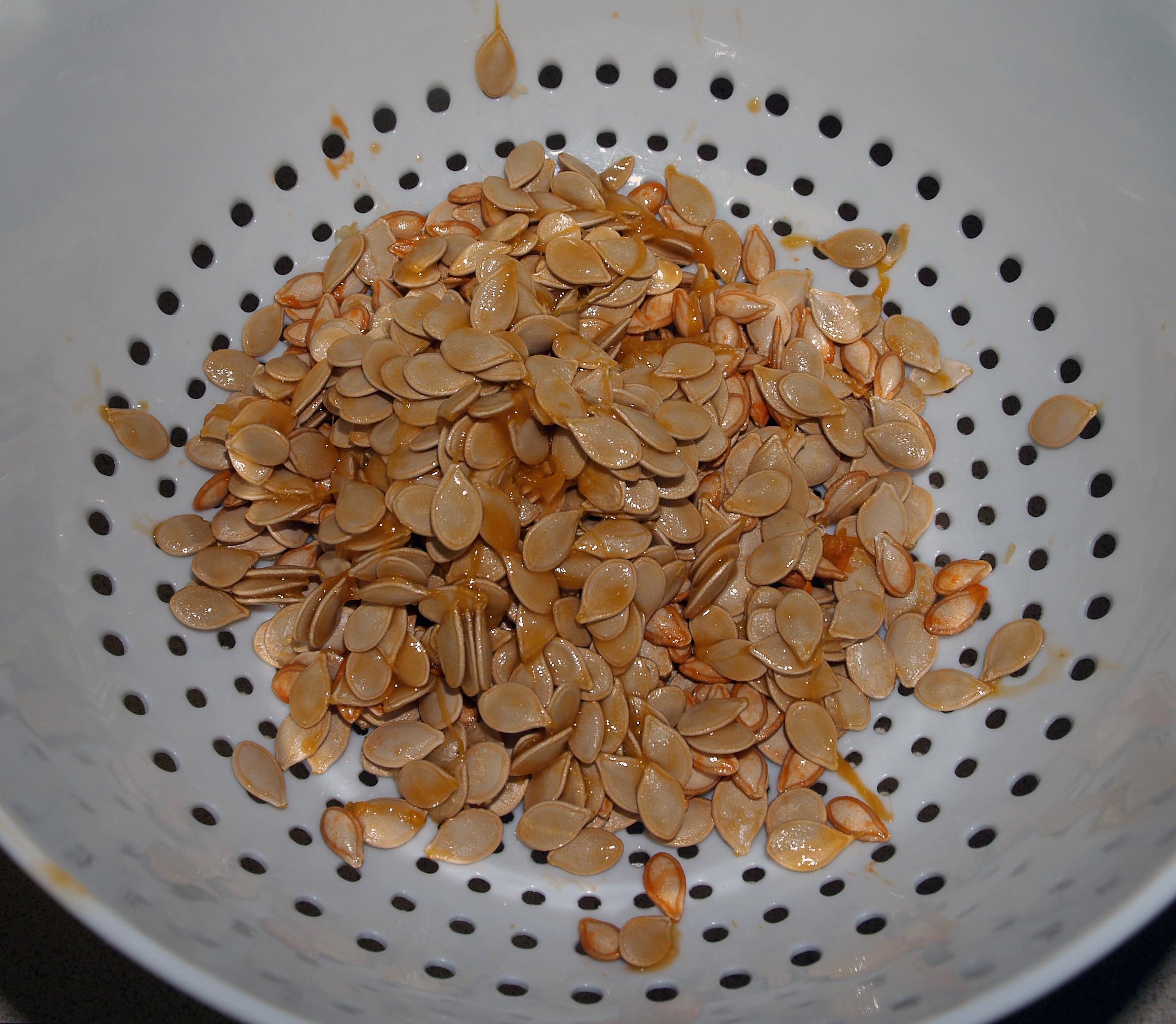 Scoop out the guts and do your best to separate the seeds out into a colander. Some strings and sludge will stick on the seeds, but that’s ok. Just try to get rid of the bigger stuff without discarding the seeds as well.