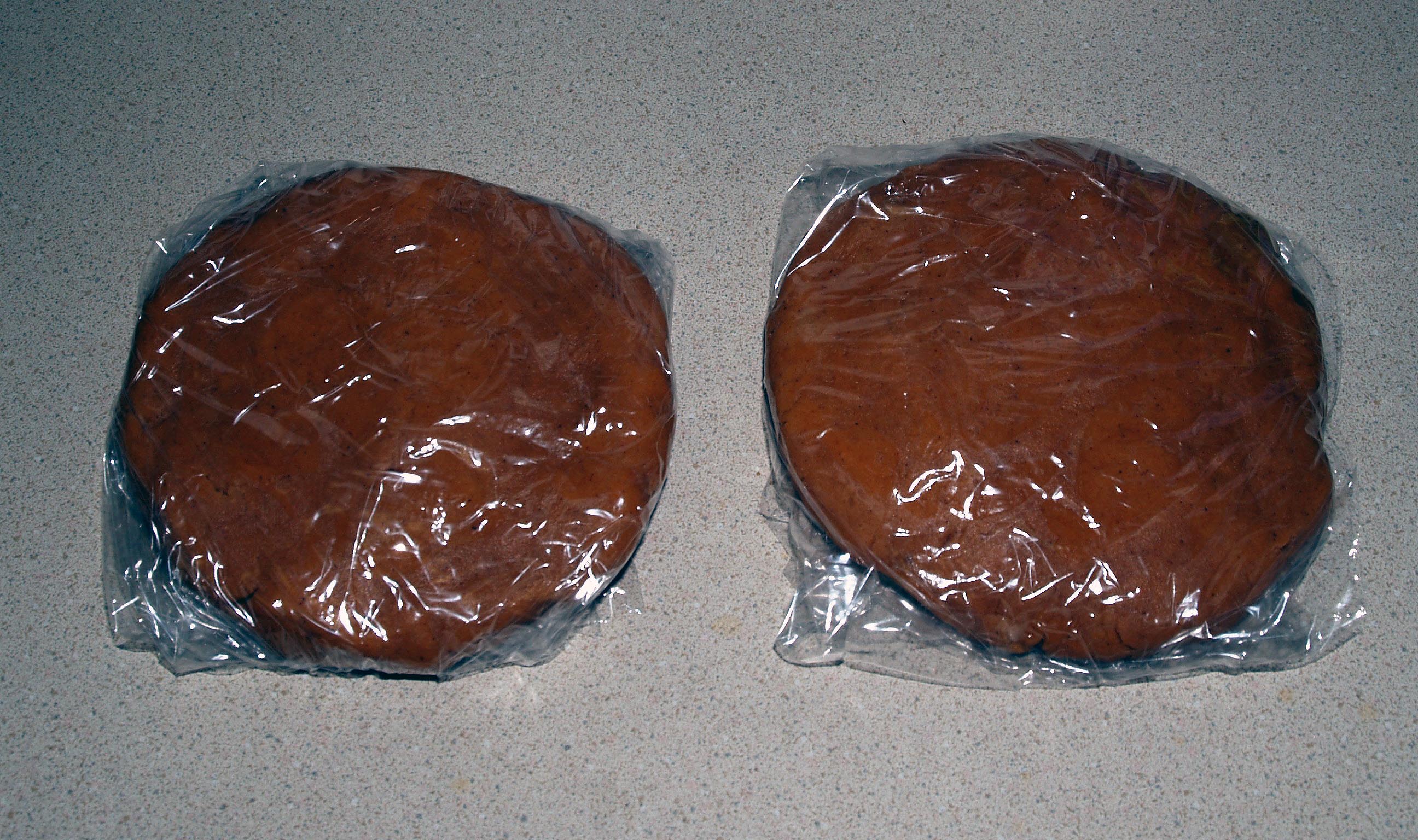 Divide the dough into three equal portions and form each into a 6″ disc. [Note: The discerning reader will notice that I only have two discs. That’s because I halved the recipe since I was making two other types of cookies at the same time and didn’t want to overload my cookie receptacles.] Wrap each disc in plastic wrap and refrigerate the dough for at least an hour or up to 1 day.