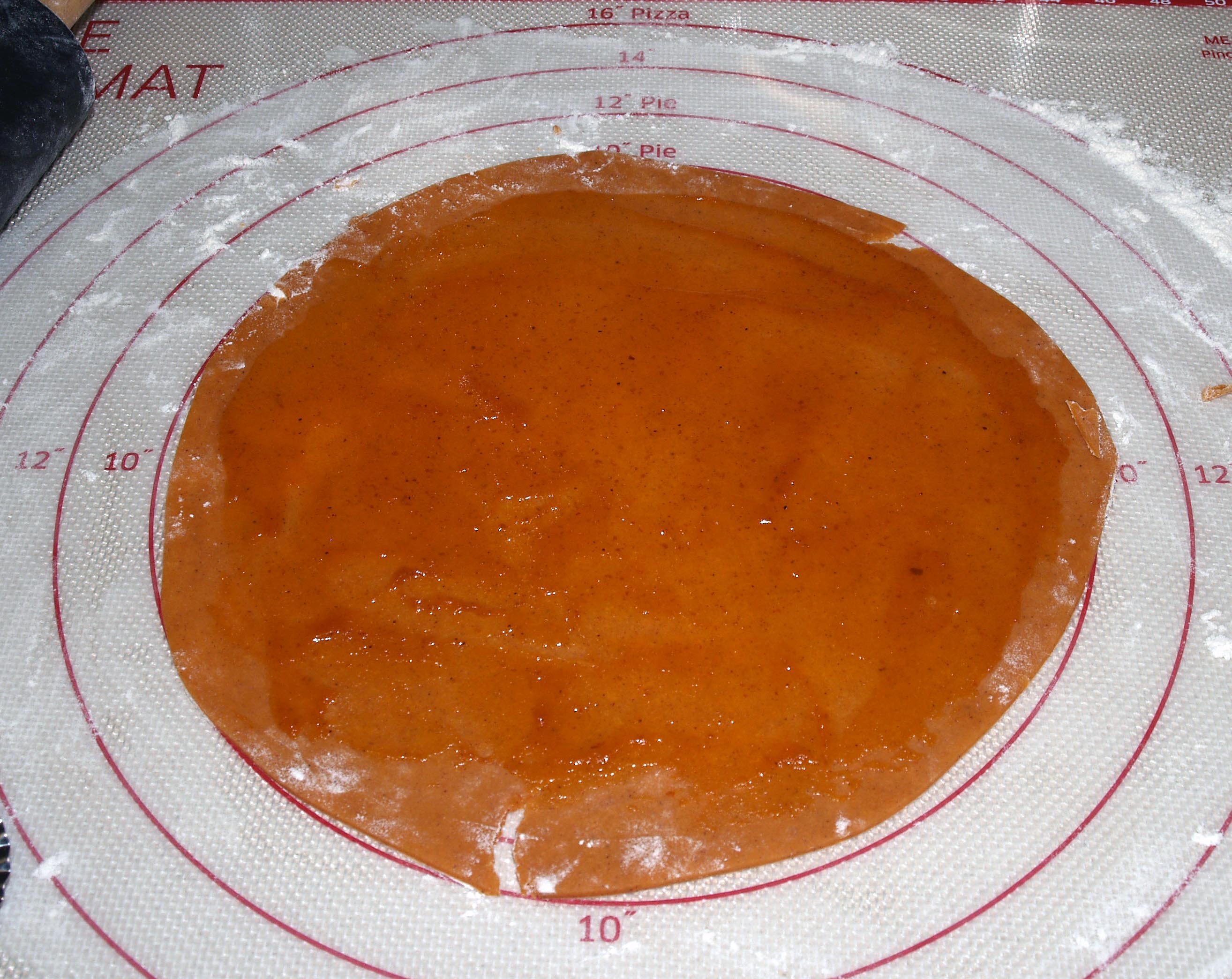 Carefully spread ¼ cup of the pumpkin butter in a thin layer over the dough, leaving a ¼” border around the edge.