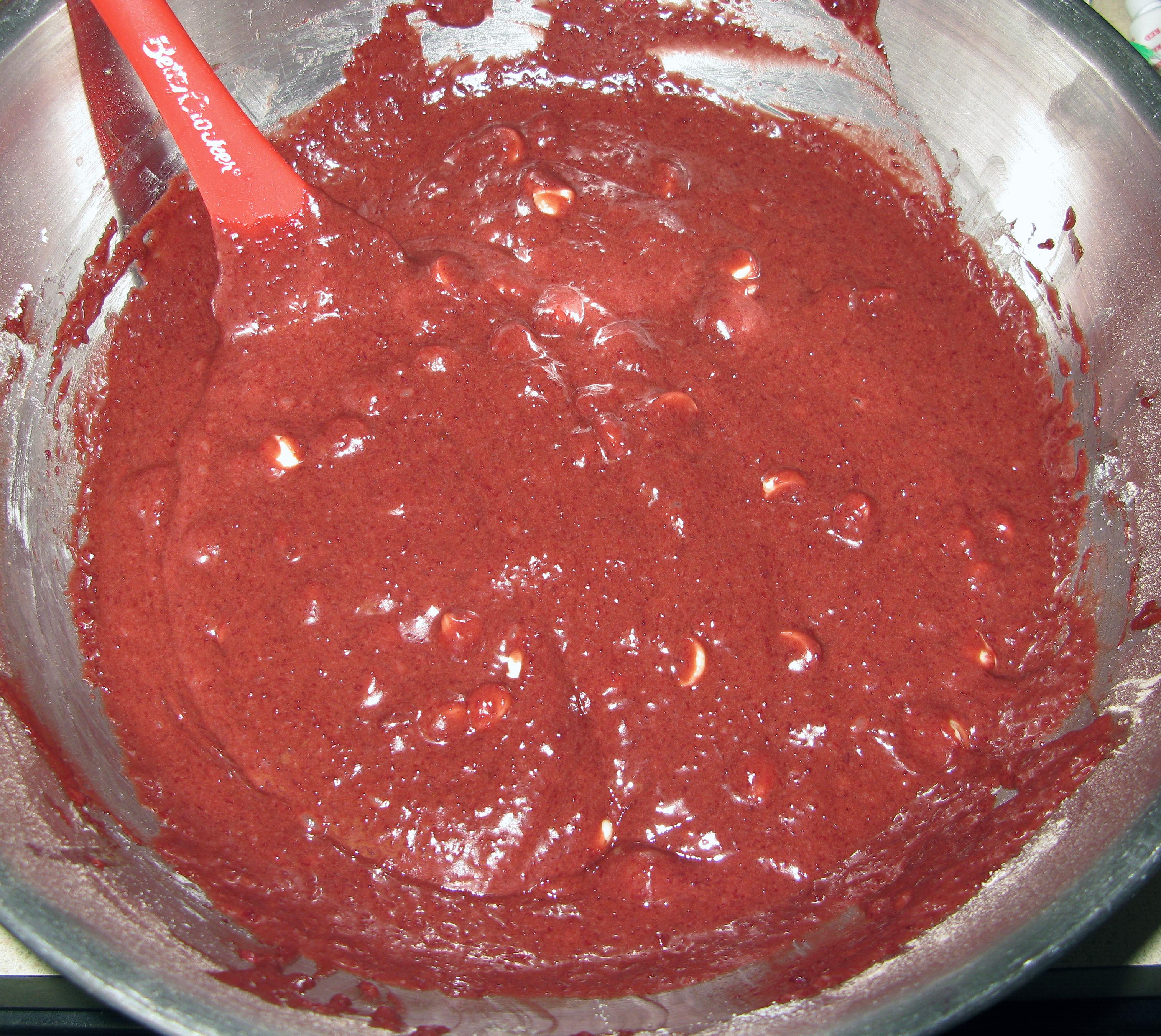 Unfortunately, while these brownies were decently velvety, they didn’t turn out to be particularly red once baked. If a bright red color is what you’re really after, you can try adding some red food coloring to brighten them up a bit. You can also swap out the white chocolate chips for semi-sweet or dark chocolate chips, chopped nuts of your choice, or a mixture. I found that that white chocolate chips melted a bit, leaving holes and streams of melted chocolate around the edges. It still tasted good, but looked a bit messy.
