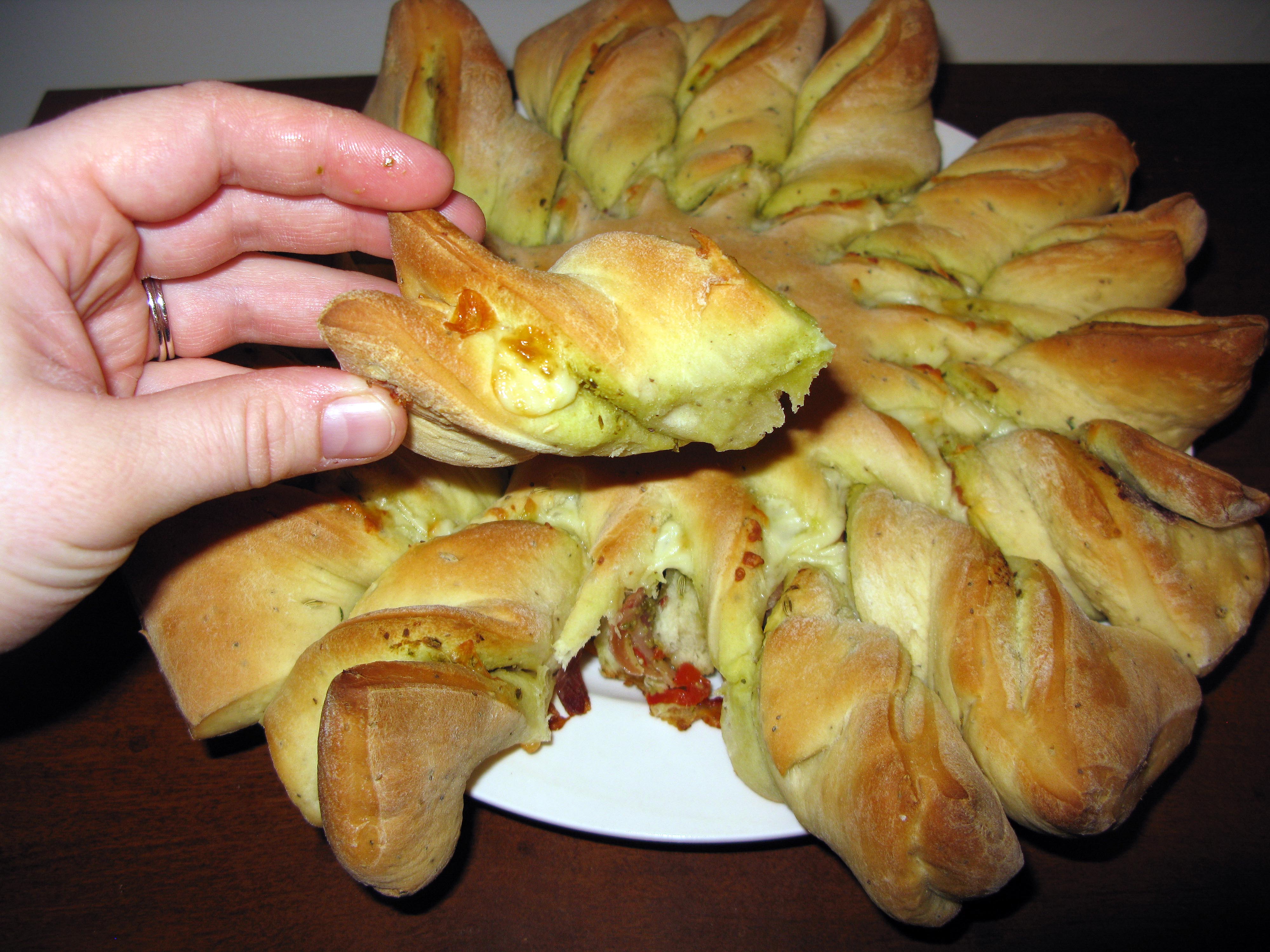 As you can see, the twists pull off easily.  You can also slice the bread into wedges.  If you expect it to all be eaten in one sitting, you could also top the middle with seasoned, diced tomatoes for added color and flavor (do not do this if you plan to save it, as the tomatoes will make the bread soggy).  Otherwise, serve plain or with marinara, and don’t forget to refrigerate the leftovers.