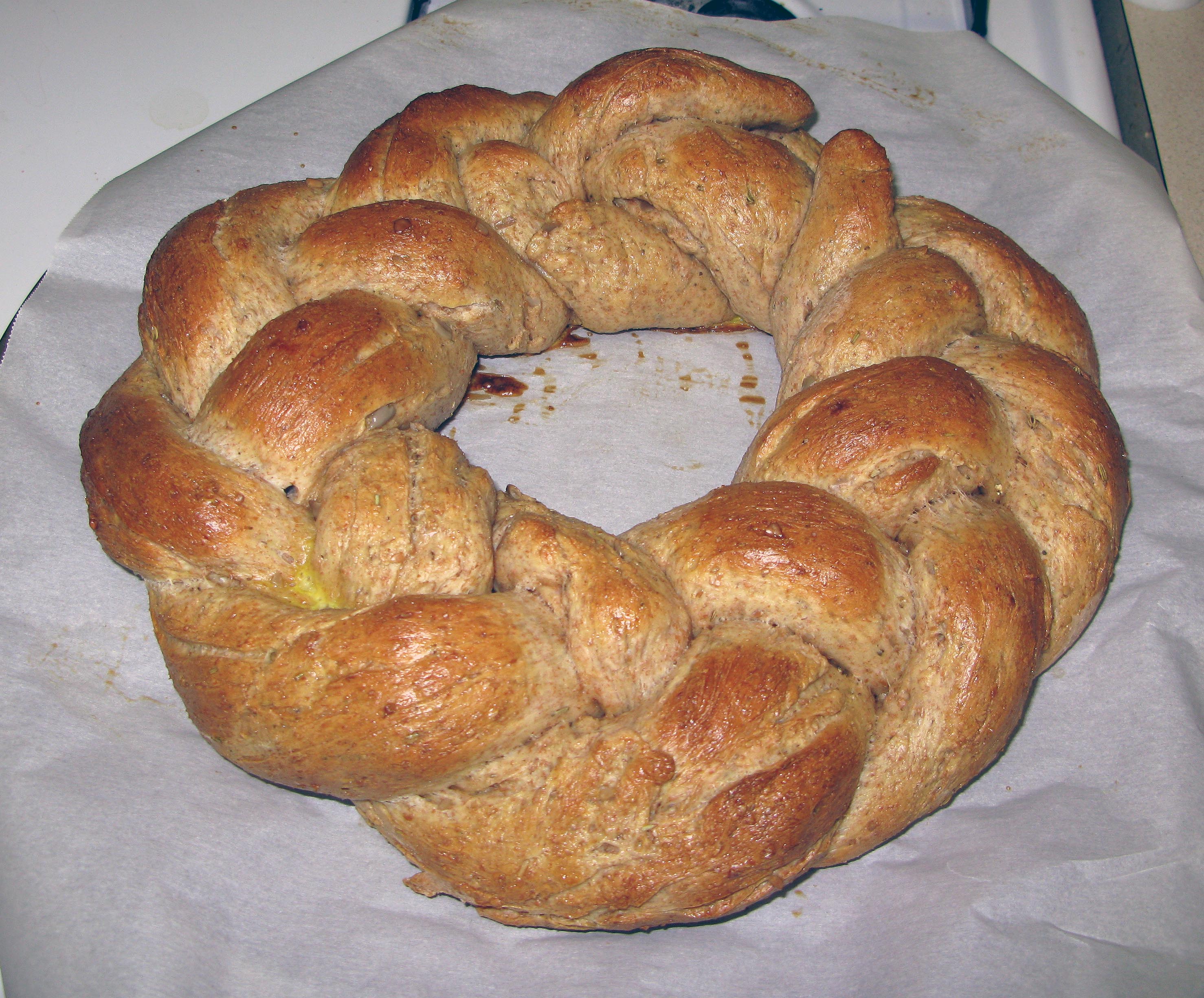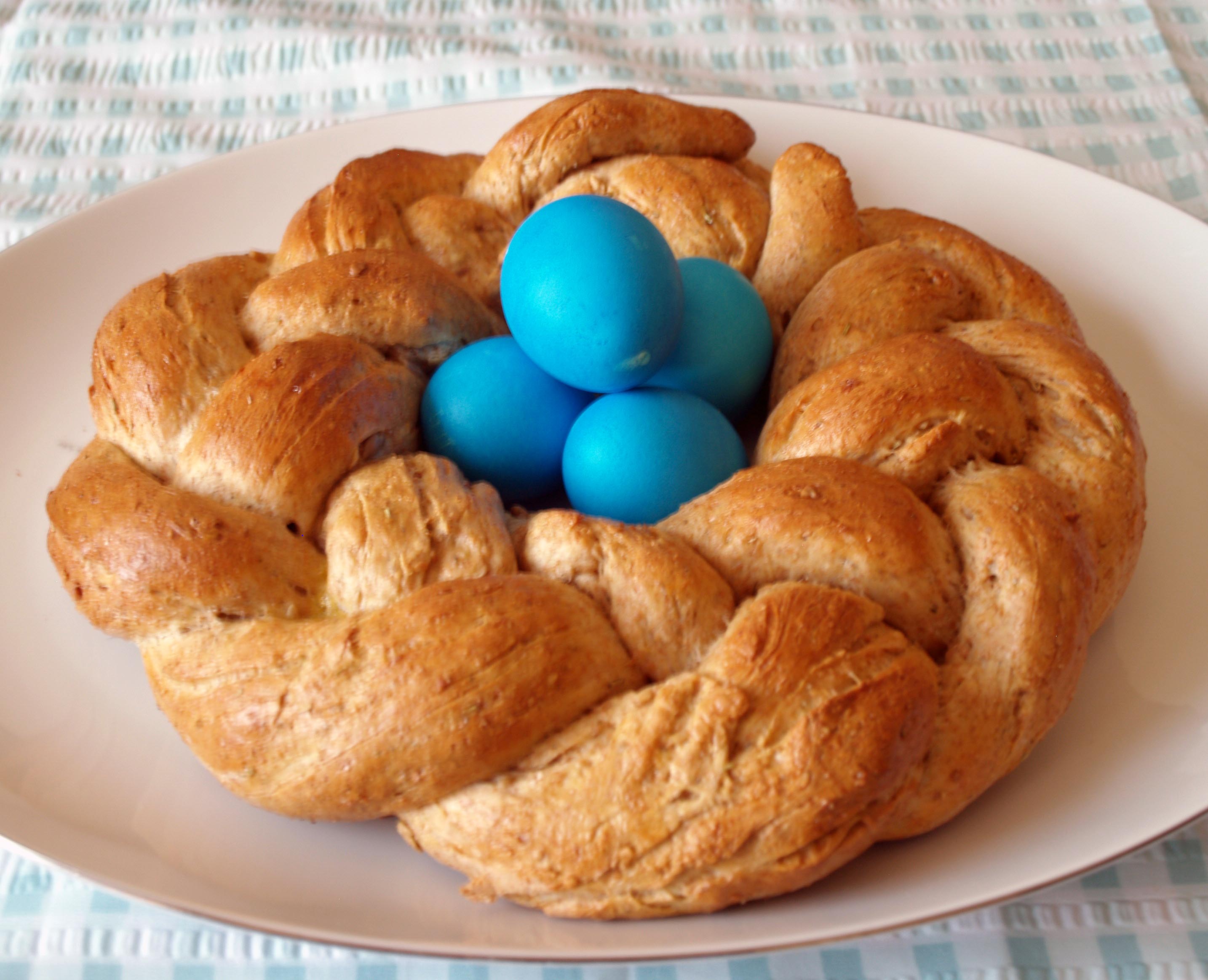 This bread was inspired by the Easter bread my mother used to make. Hers is a plain, white, braided bread formed into a ring with dyed Easter eggs woven into it, so it wasn’t quite what most people probably think of as Easter bread. I decided to use the idea of the braided bread with Easter eggs as decoration, but turn it into a nest for the eggs instead. I chose to use blue eggs to make it look like a robin’s nest, but brown or white would also make good bird’s nests, and any assortment of colored eggs would be fun.