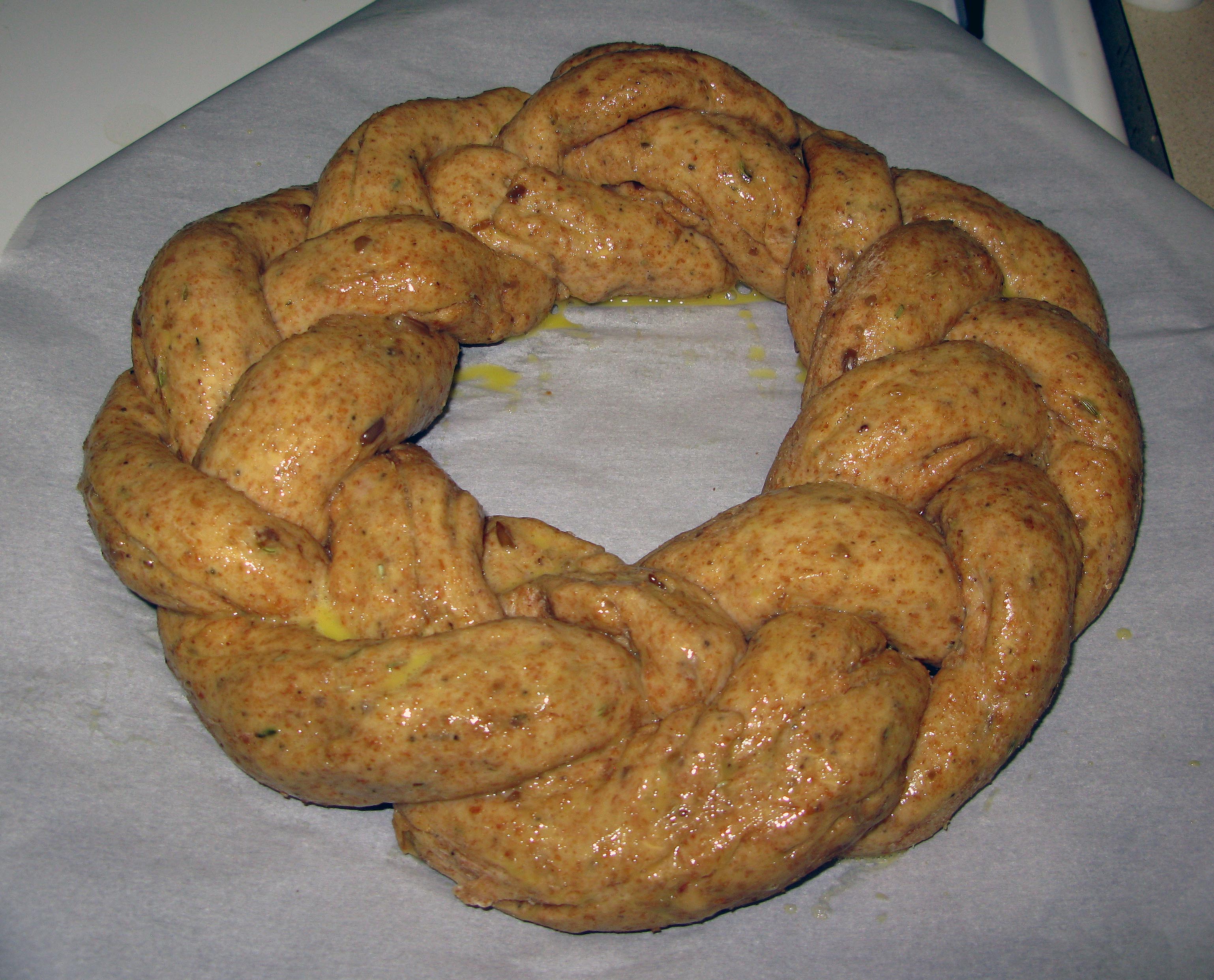 Braid the ropes together, then form the braid into a ring on a parchment-lined pizza pan or cookie sheet. It could be helpful to leave the first and last 3 inches unbraided so that you can braid them together at the end for a cleaner/more polished braided ring.