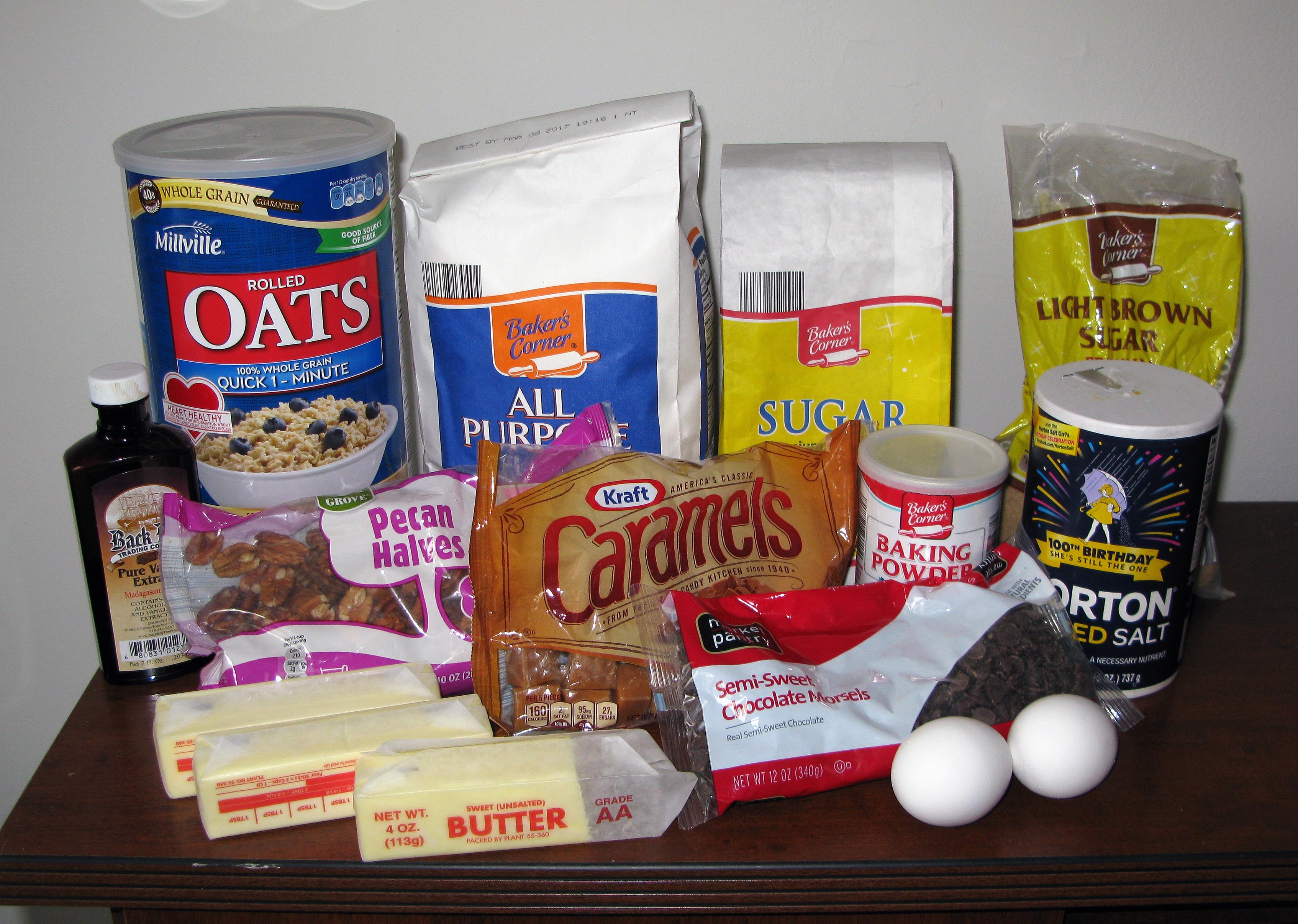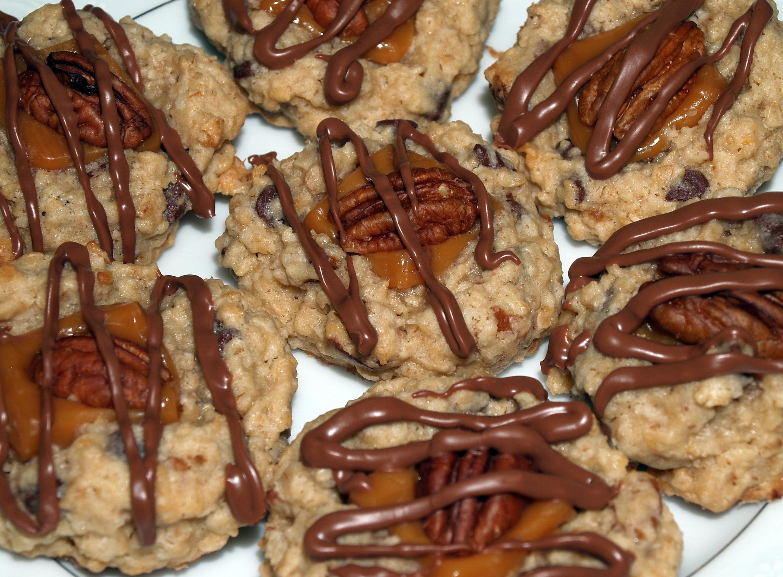 The turtle cookie from Presti’s is essentially a pecan sandy with caramel and chocolate drizzled on top. I could have recreated their cookie, but where’s the fun in that? Instead, I decided to turn an oatmeal raisin cookie (specifically, Quaker’s Vanishing Oatmeal Raisin cookie) into a chocolate turtle. I switched out the raisins for a mix of chocolate chips and chopped pecans and increased the volume of mix-ins to make it crunchier. For a bit of added panache, I stuck half of a melting caramel in the center of each cookie and then pressed a pecan half into the melted caramel once the cookies had baked.