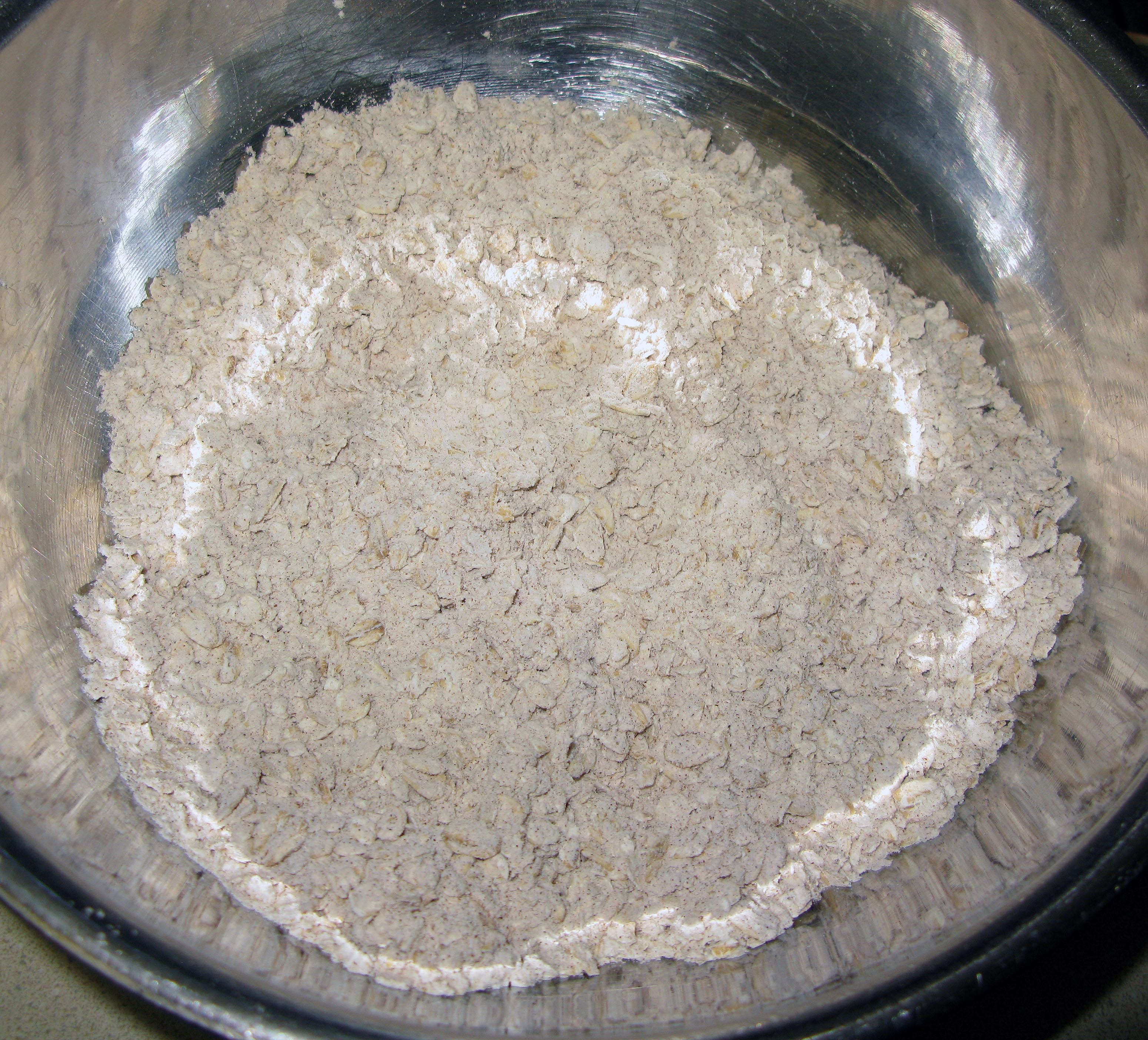 In a medium mixing bowl, whisk together the oats, flour, baking soda, salt, and cinnamon until they are well-combined.