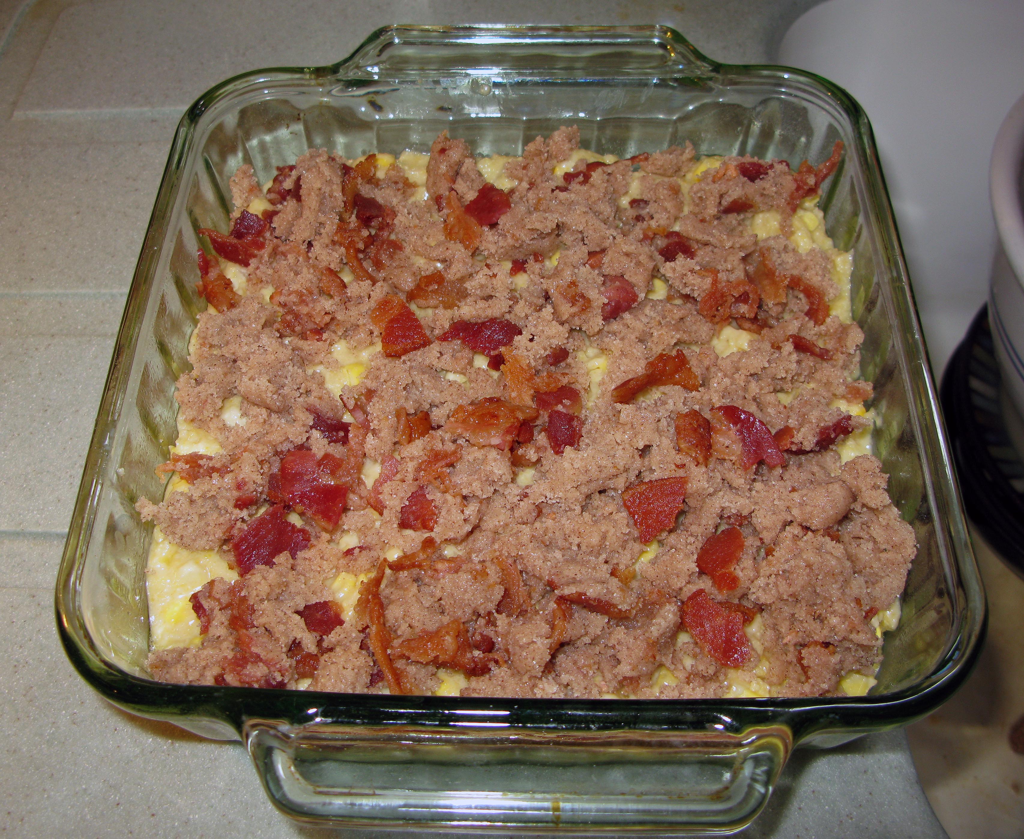 Add the crumbled bacon and mix until it is evenly distributed. Sprinkle the topping across the top of the buckle batter.