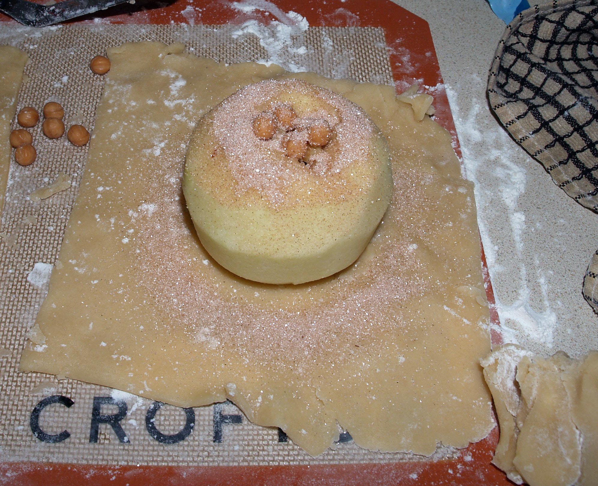 Place one apple in the center of each square of crust. At this point, it’s a good idea to make sure that your crust squares are big enough. Bring the corners together over the center of the top of the apple (see below for pictures). If they don’t overlap, slice off enough of the bottom of the apple to make it fit (unplanned snacks, yea!).