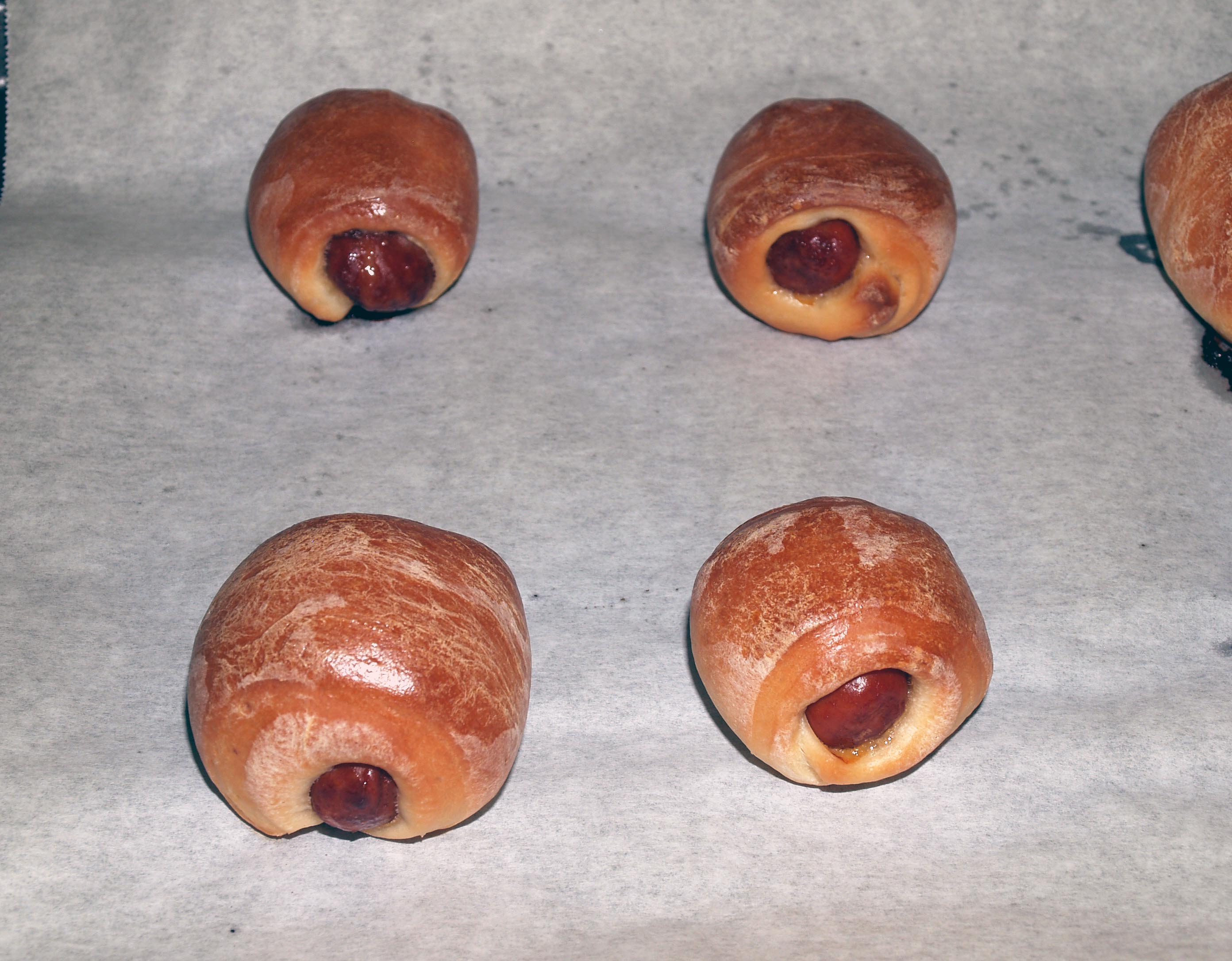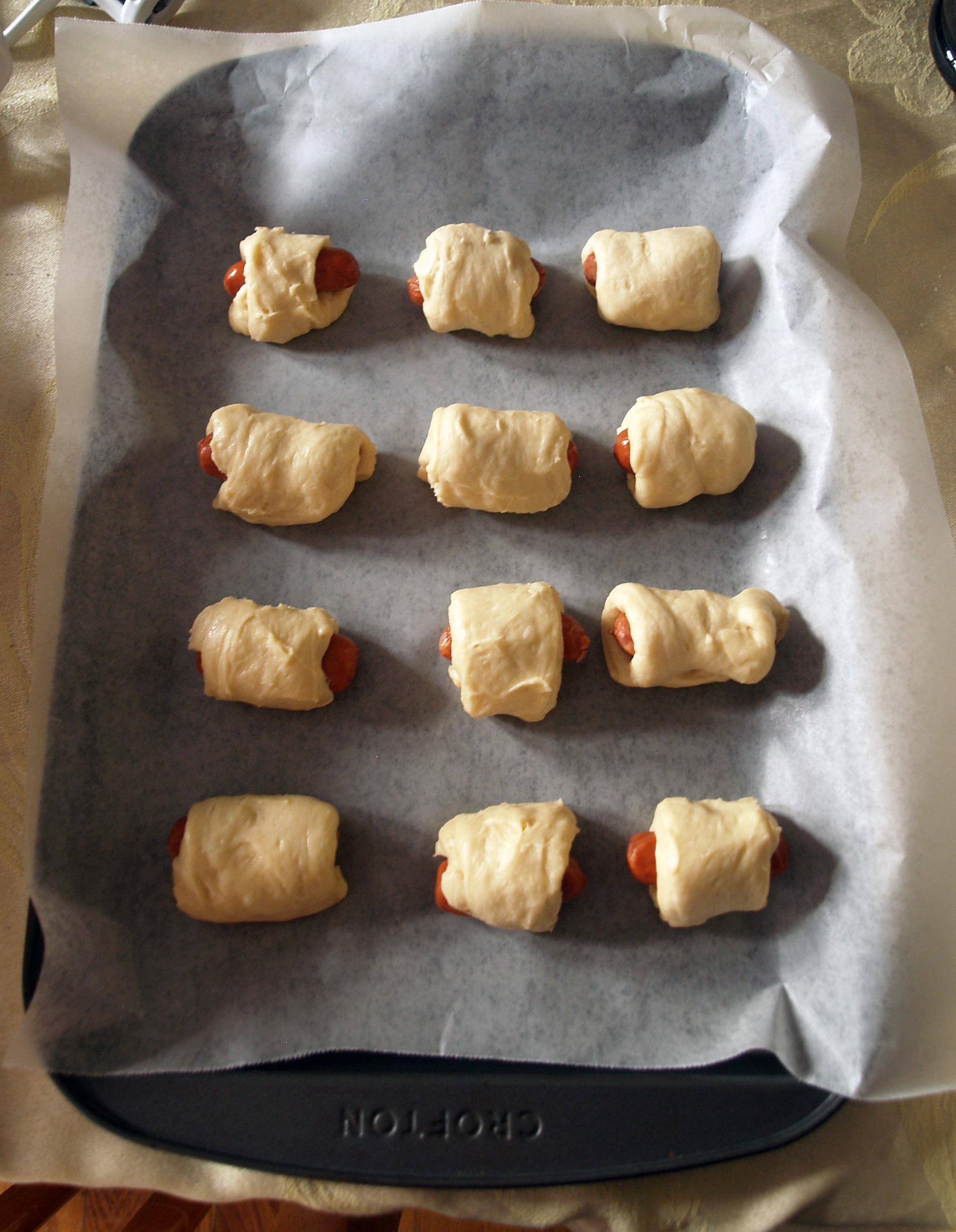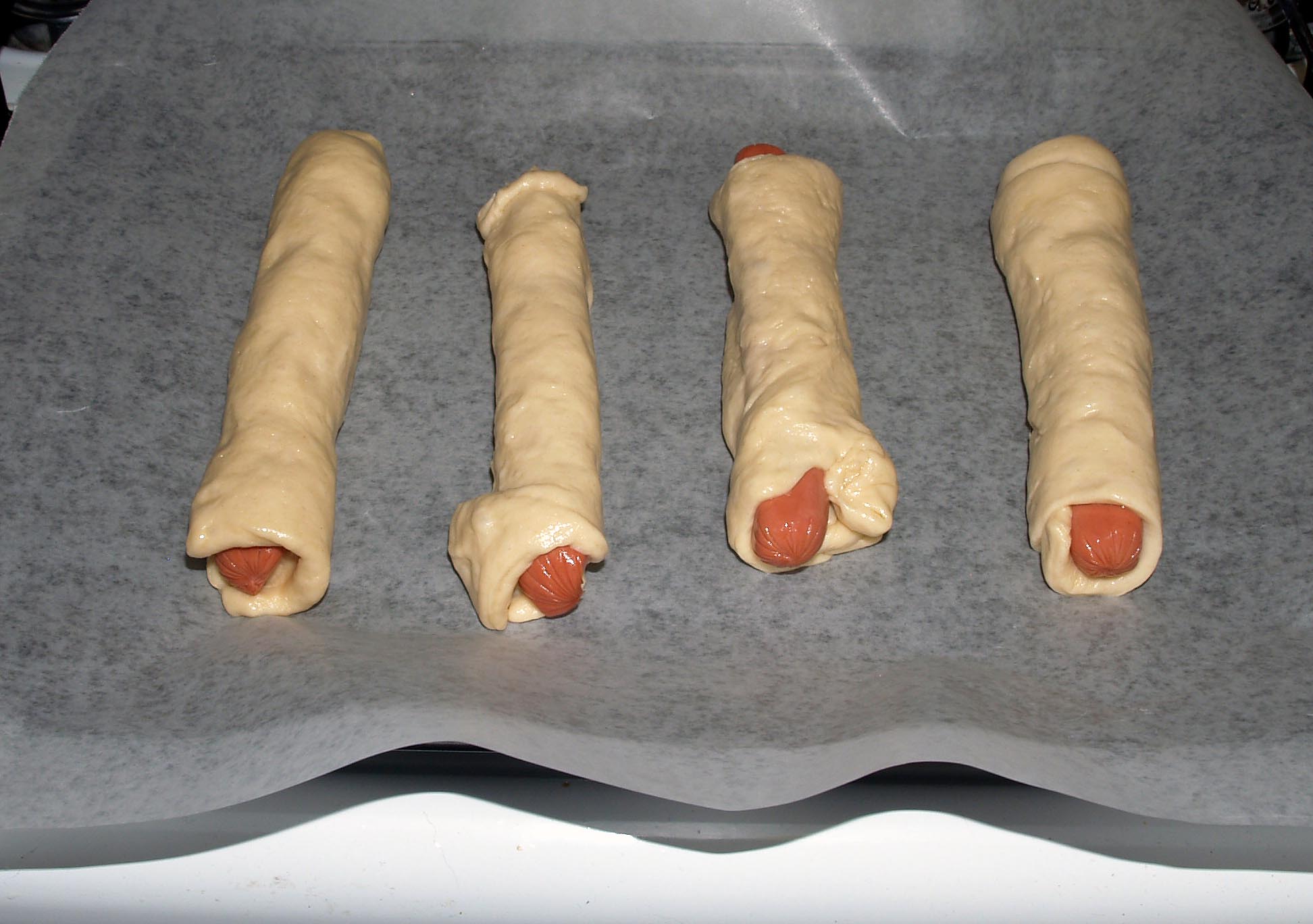 Roll the hot dog inward, wrapping the dough around it as you go. When the dough completely encases the hot dog, cut it off where the end meets.