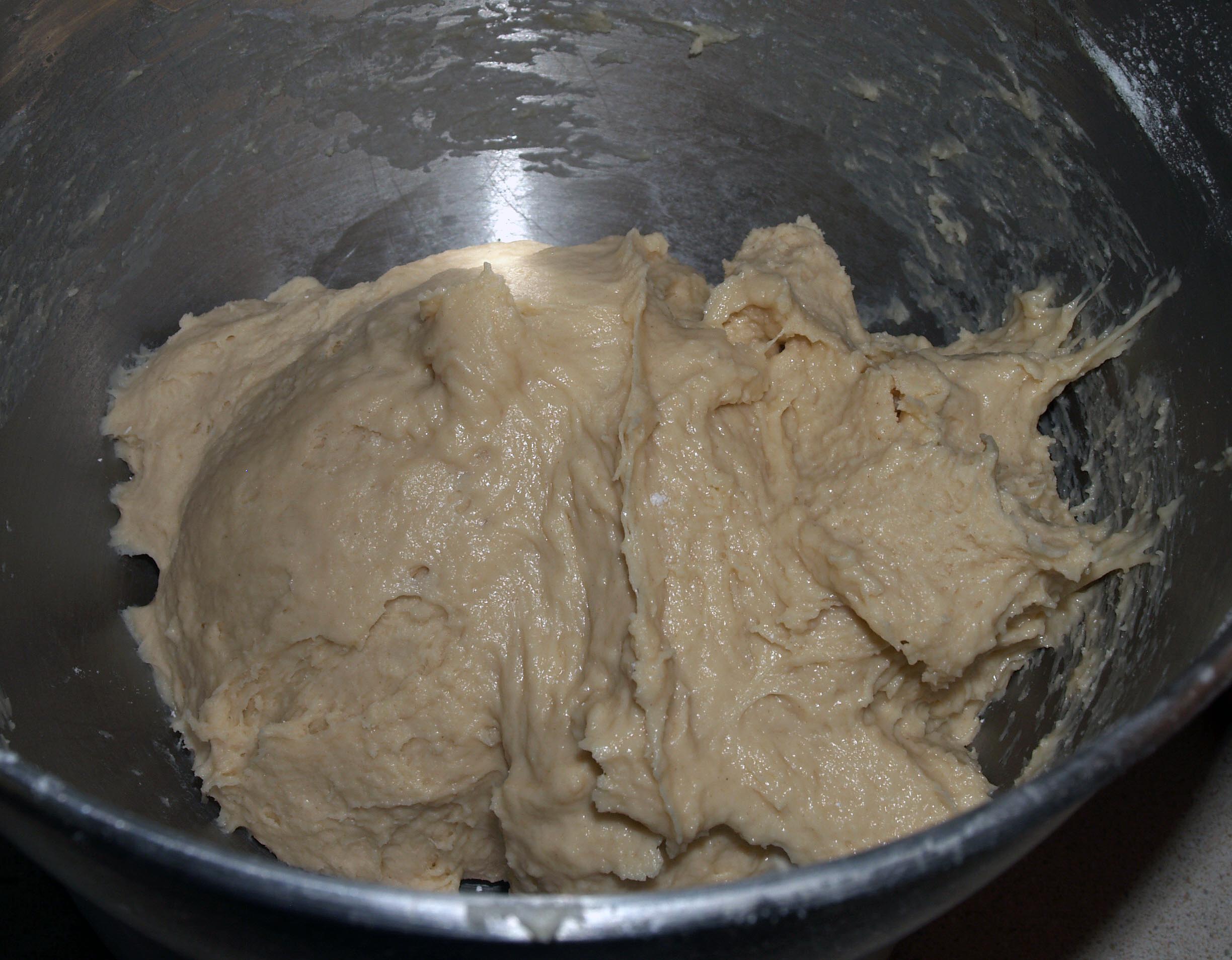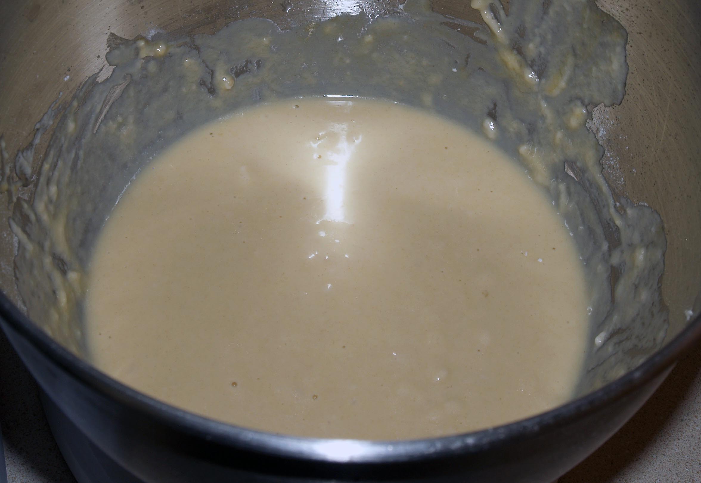 Using a dough hook or a wooden spoon, stir in the vegetable oil, eggs, salt, and 1¼ cups of bread flour until you have a smooth slurry.