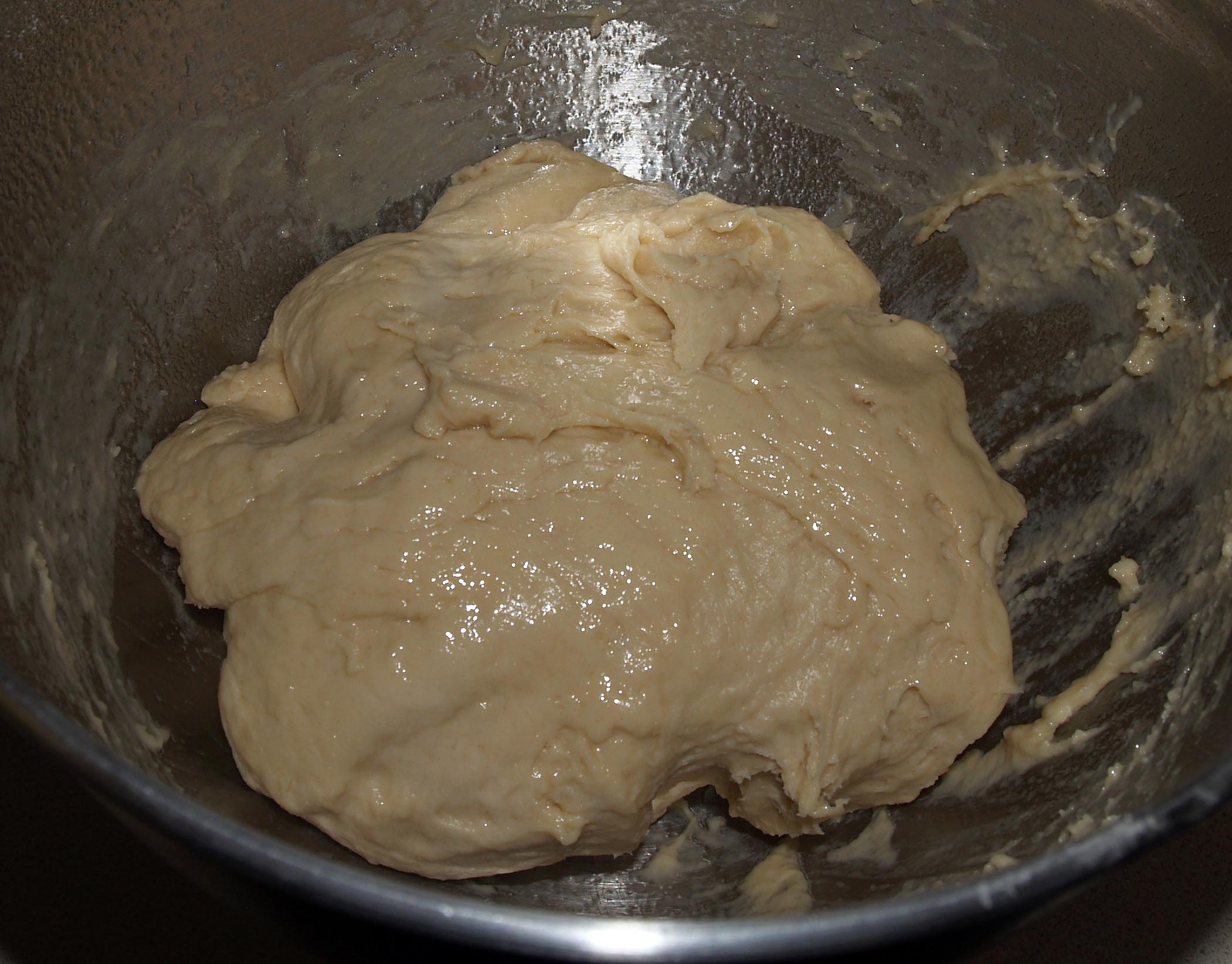 Stir in the remaining flour, 1 cup at a time, and knead for 5-10 minutes (using the dough hook or by hand on a lightly-floured surface) until it forms a generally smooth dough. The dough will be a bit sticky.