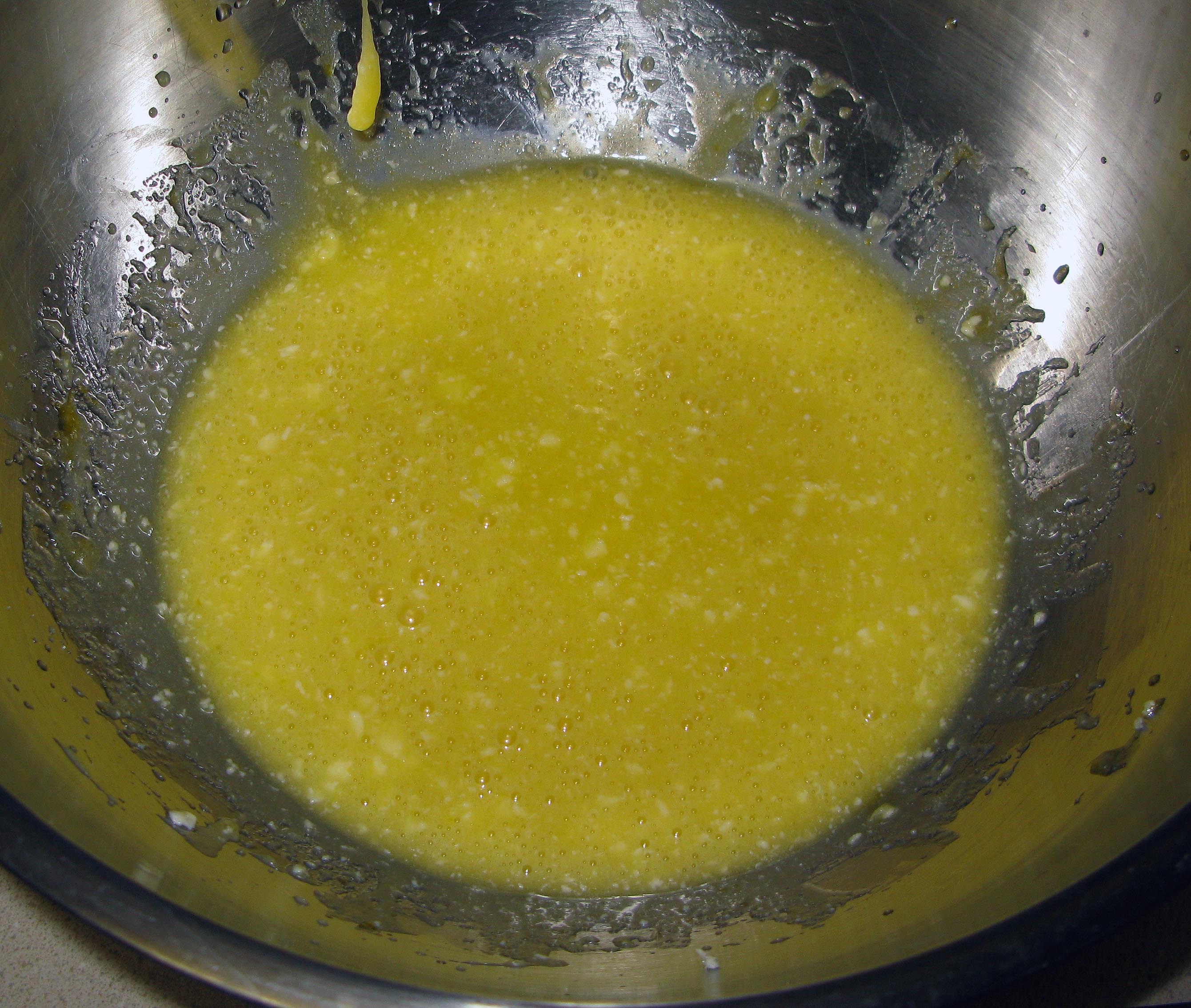In a large bowl, beat together the vegetable oil, butter, sugar, and eggs for 2 minutes with an electric mixer on medium speed.