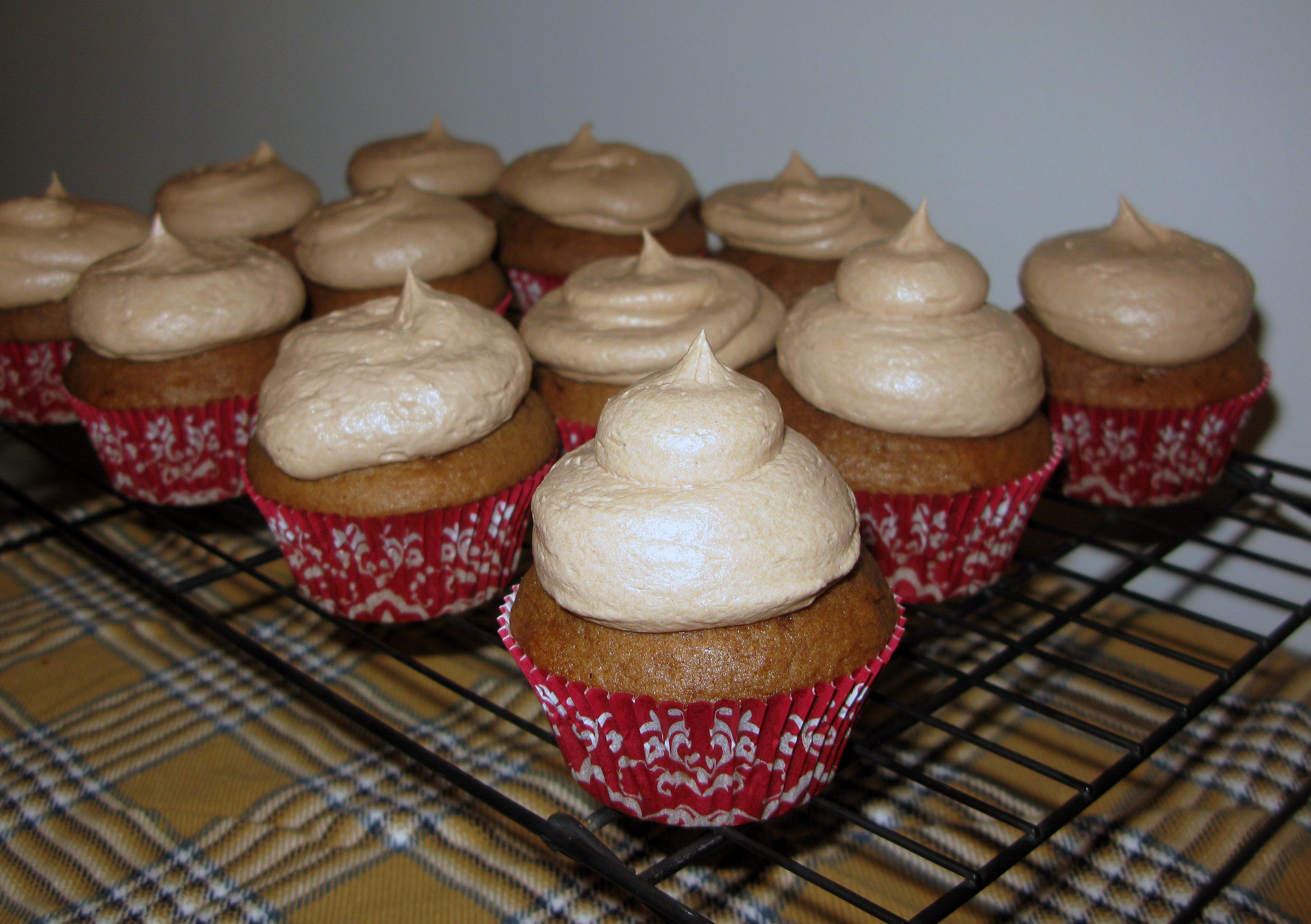 When the cupcakes are cooled, frost them as desired. I tried a few different things and decided I liked a simple, even blob of frosting on each cupcake best in this instance.