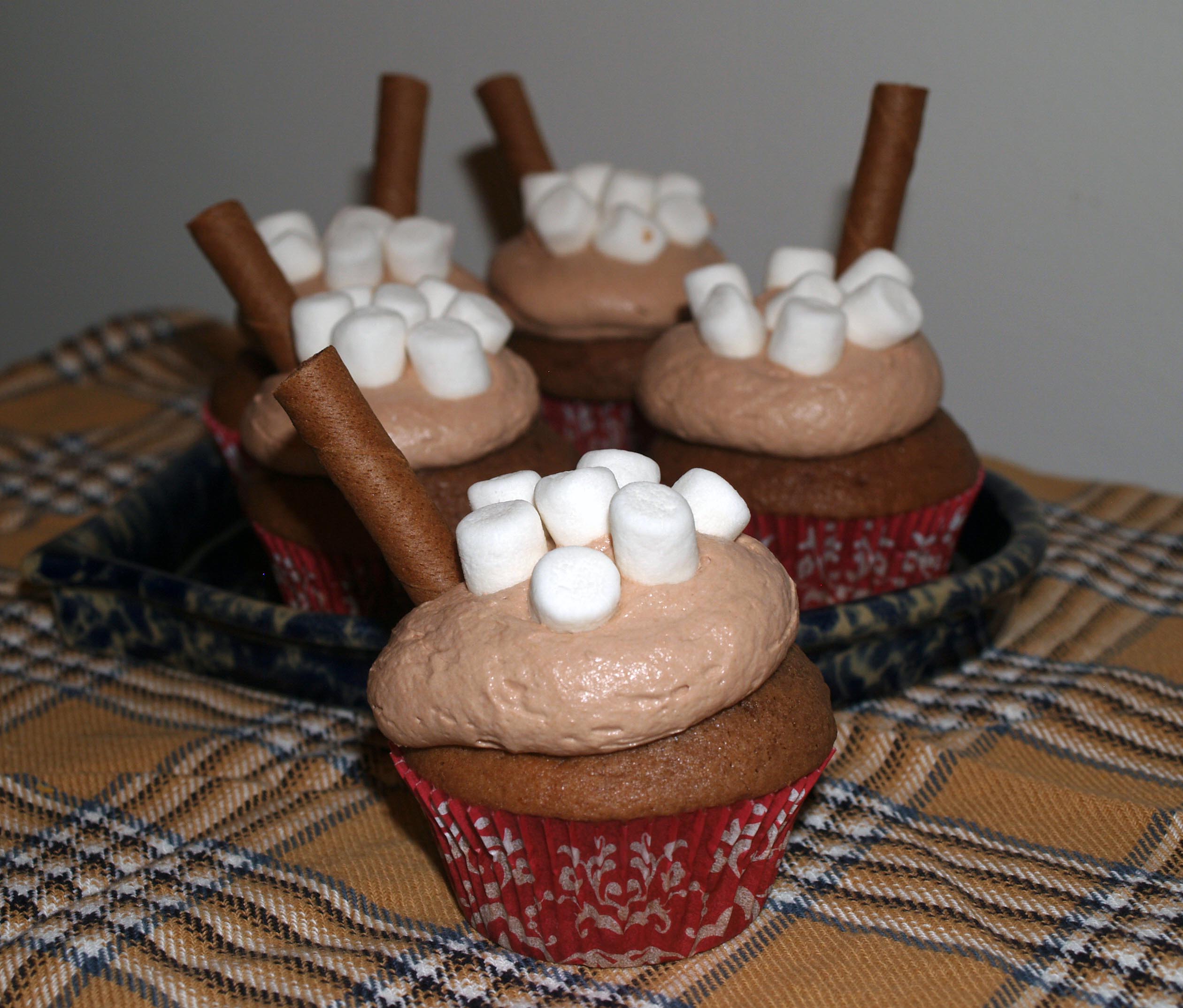 It turns out that most chocolate cupcake recipes these days are written under the assumption that darker is better. While I won’t deny that a dark chocolate cupcake is tasty, sometimes you just want something more mellow. To better capture the creamy texture and sweetness of powdered hot chocolate made with milk, I decided to try a milk chocolate cake recipe instead. I followed this recipe by King Arthur Flour pretty much exactly, and it turned out pretty well. I followed their suggestion of replacing the cocoa powder and powdered milk with hot chocolate mix (Land o’ Lakes is my absolute favorite) to be more faithful to the inspiration, and it did not disappoint. The taste of the cake was good, but it was a little bit dry. If I were to make it again, I would probably try using all vegetable oil for shortening, rather than a mix of butter and oil, and possibly substituting some or all of the buttermilk with sour cream for some added moisture.