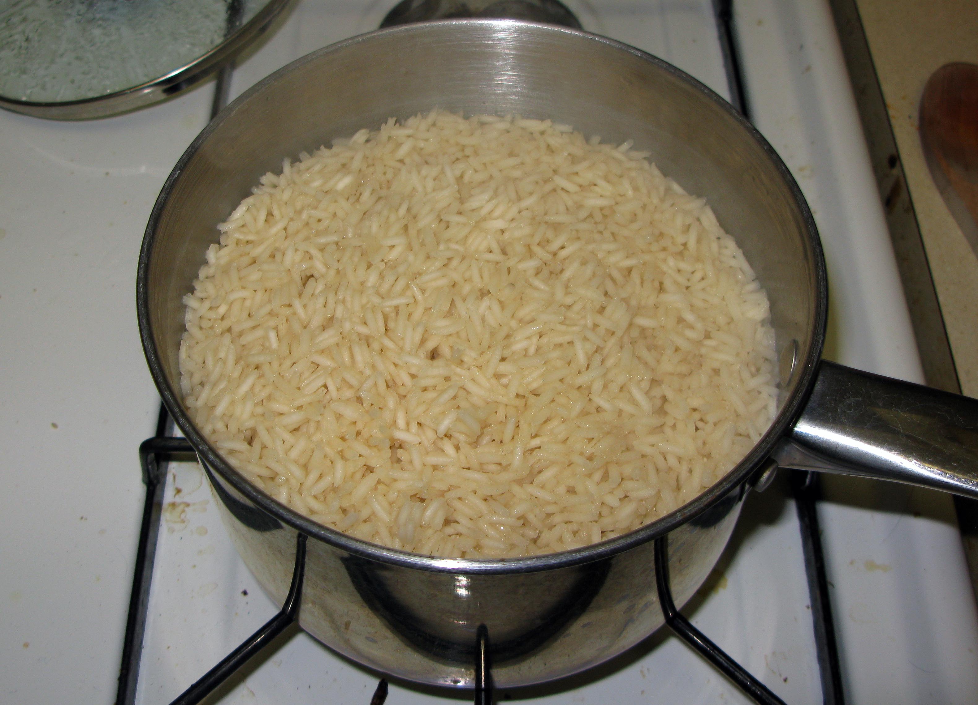 Combine the rice and chicken stock in a medium saucepan and bring to a boil. Stir, reduce to a simmer, and cover. Cook the rice for about 10 minutes, or until it is mostly cooked and the chicken stock is absorbed. Remove the saucepan from the heat and leave it covered.