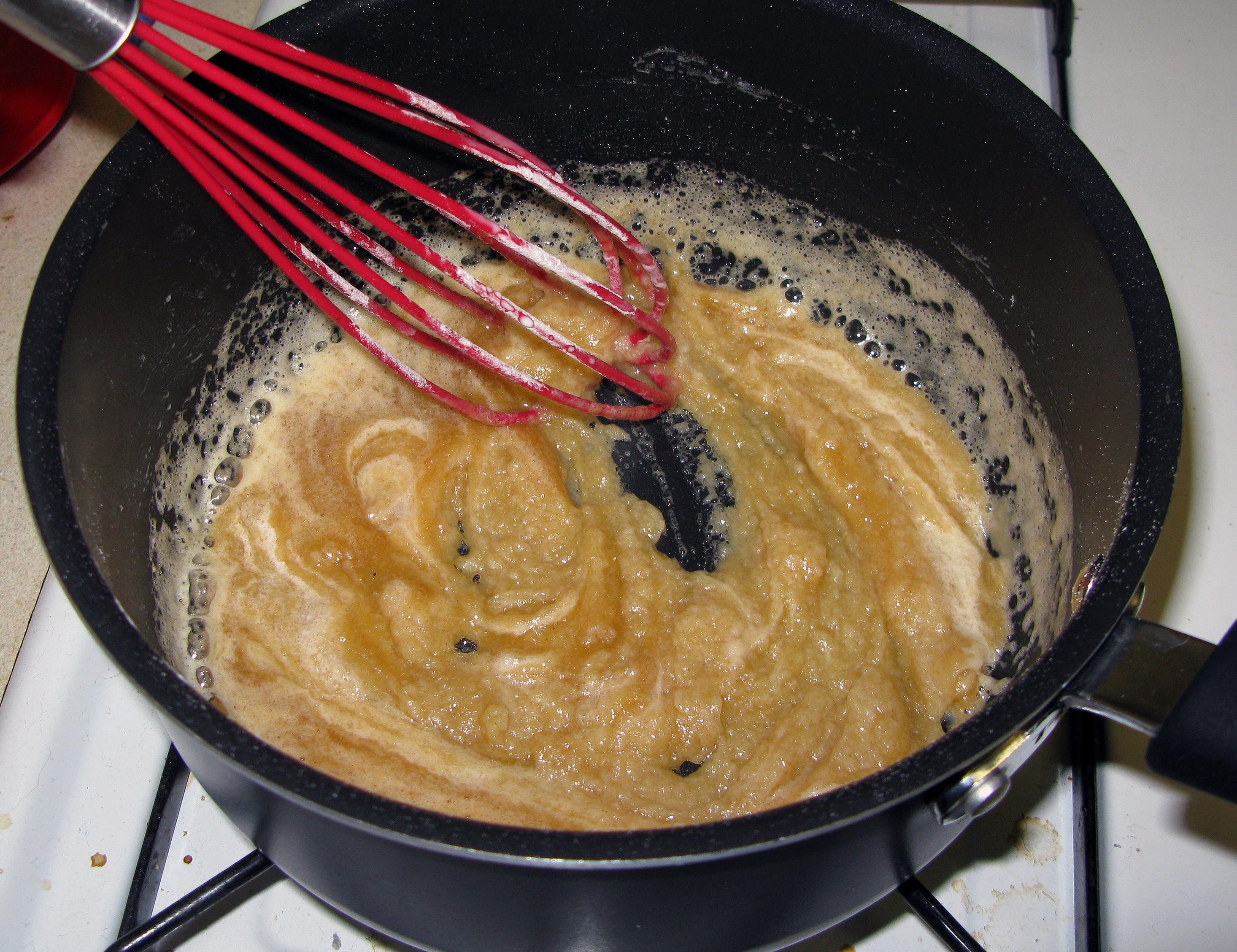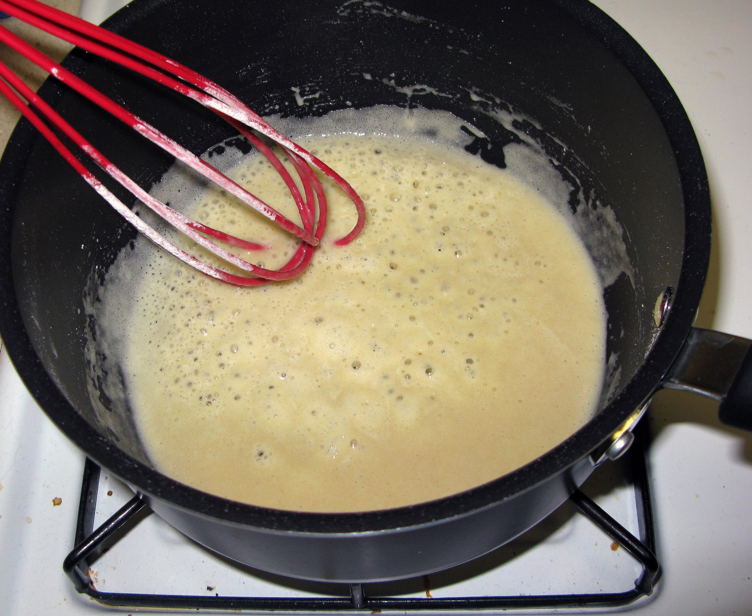 Raise the heat to medium, still whisking continuously, and bring the sauce to a simmer. Continue to cook it until it thickens. As you can see in the picture below, the sauce will stick to the side of the pan when swirled.
