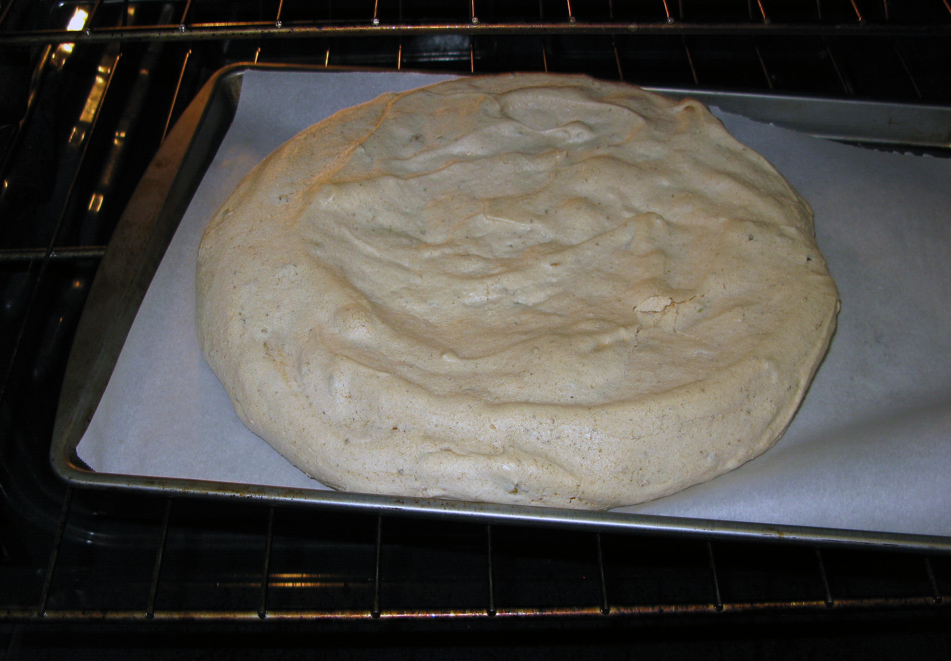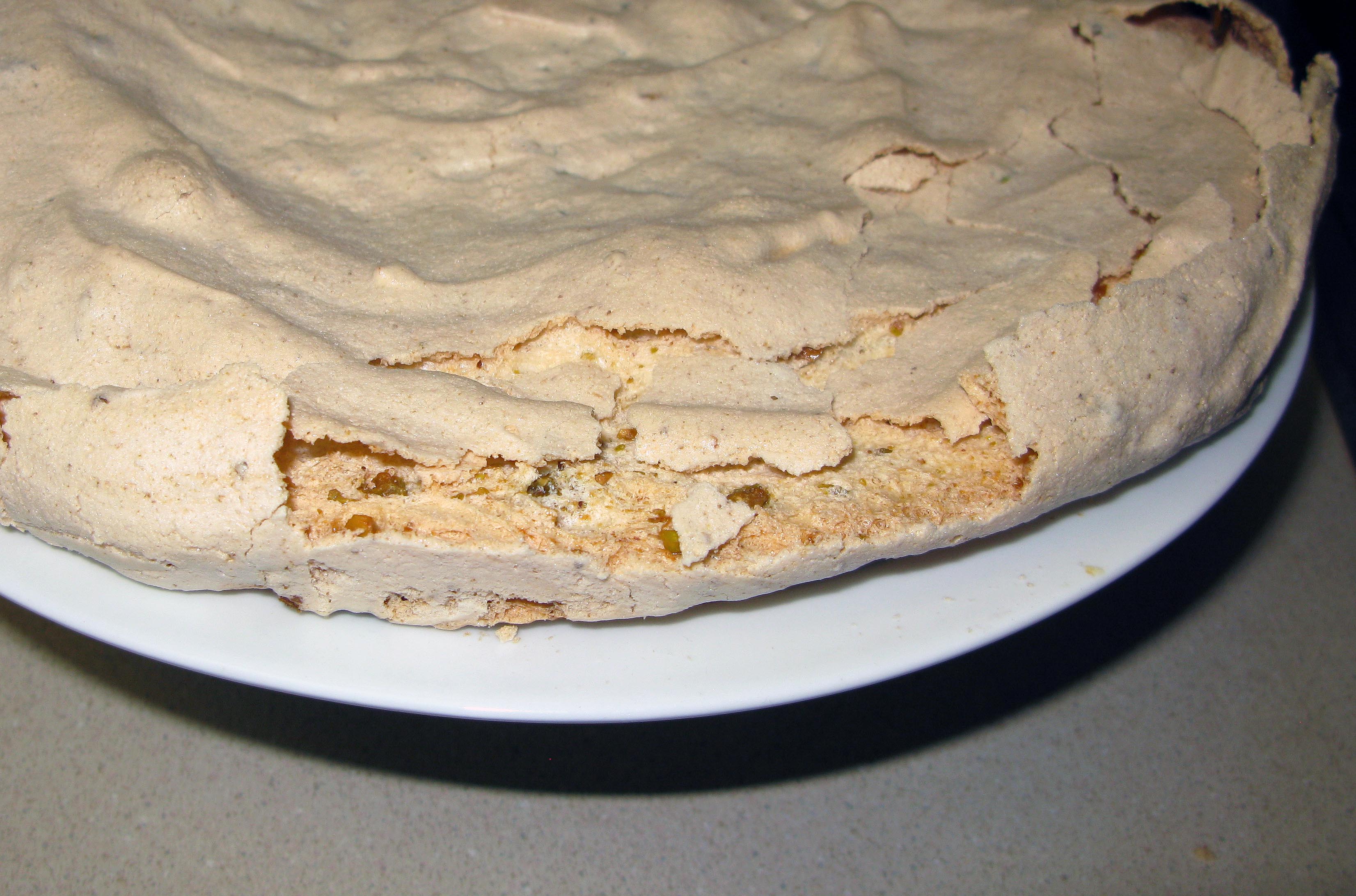 My meringue layer did crack a bit around the edge (see below), but according to the recipe’s description, this is ok. In the future, I might try baking the meringue at a lower temperature to prevent the edges drying out as they did. One critical step that should not be skipped is cooling the meringue in the oven. As far as I know, this is true of most hard meringue recipes. Slow cooling helps prevent cracks in a properly baked meringue. If it’s overbaked, it will crack anyway, but this is one thing you can do to give your meringue the best chance at survival.