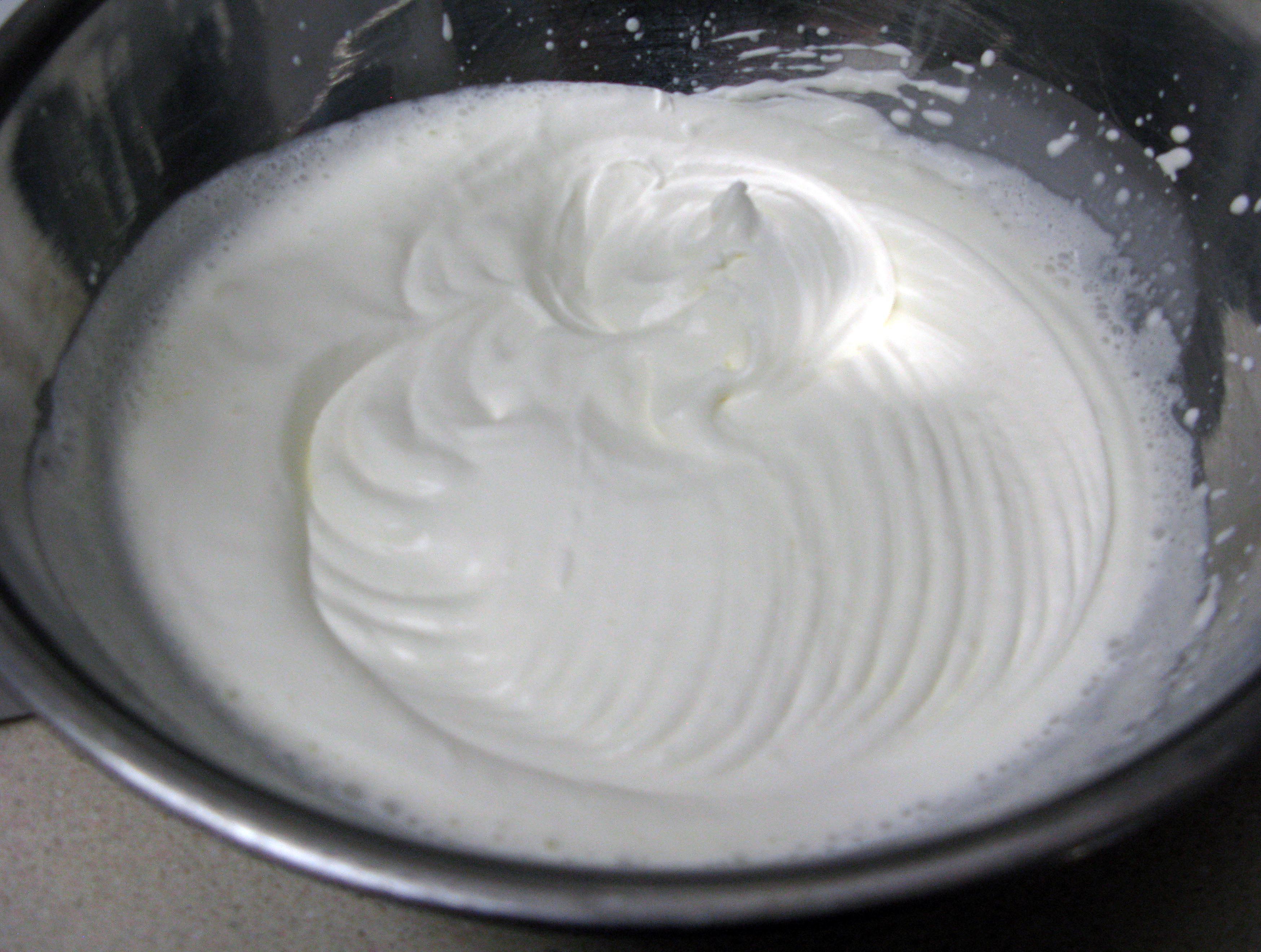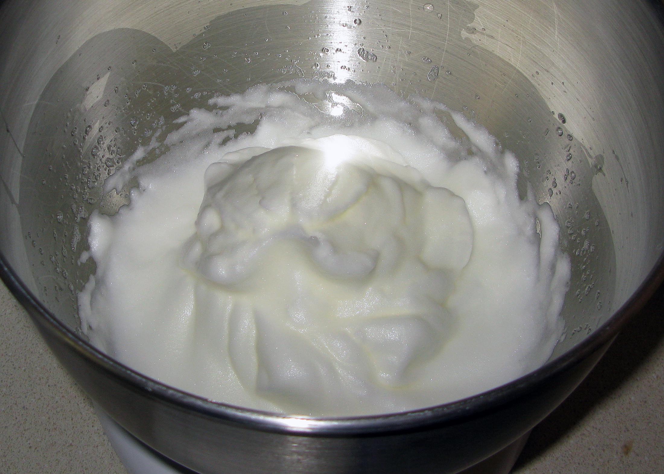 Using a stand mixer with a whisk attachment, whisk the egg whites on medium speed until they hold stiff peaks, about 10 minutes. The original recipe describes the consistency as “cloud-like,” and I’d say that’s pretty accurate. You can do this with a hand-held electric mixer or by hand, but it will take longer (and I pity your forearms if you do it all by hand).