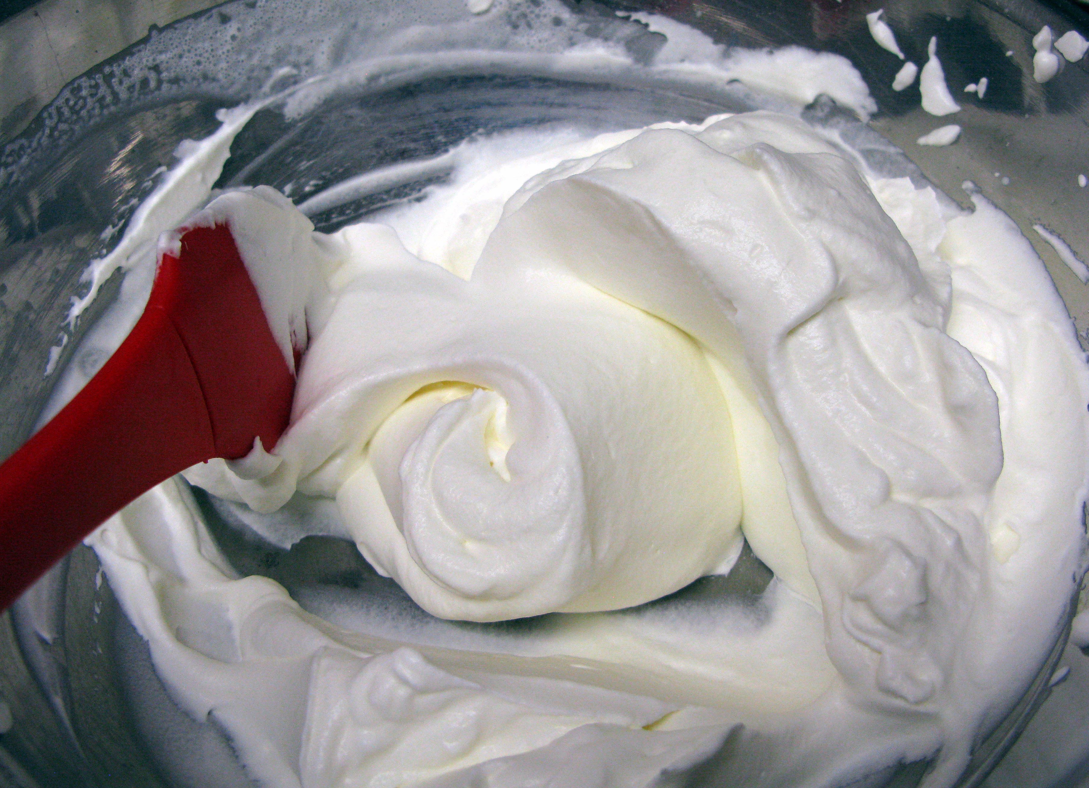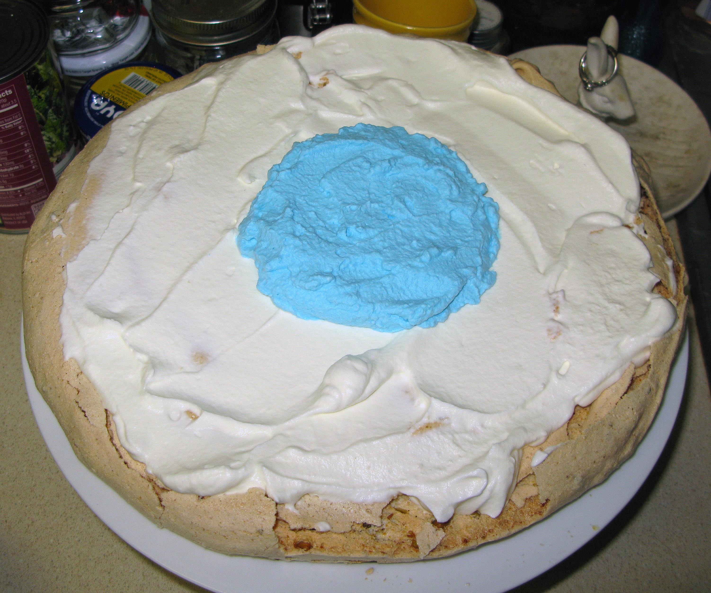 Spread the remaining white whipped cream on top of the meringue, leaving it a little bit thinner in the middle.