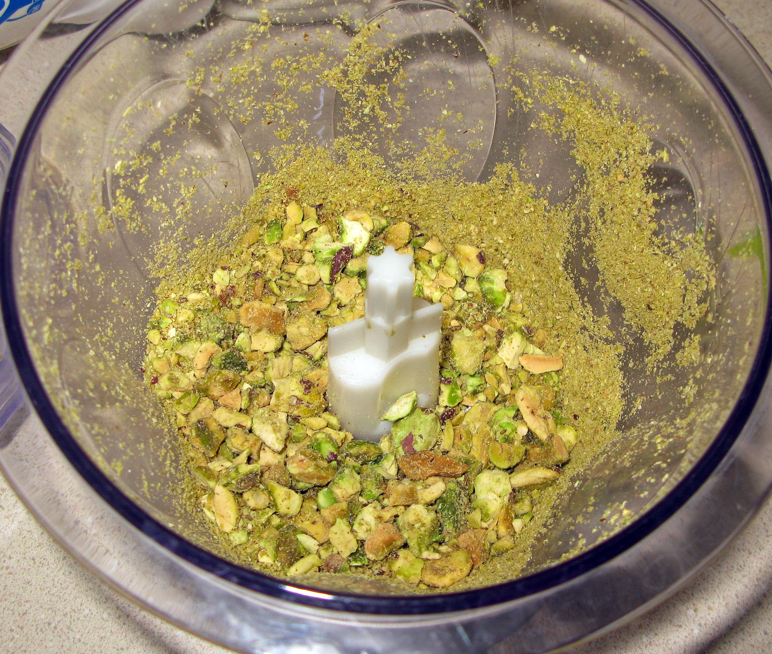 Chop your pistachios into largeish chunks using a food processor or a knife. Set aside.