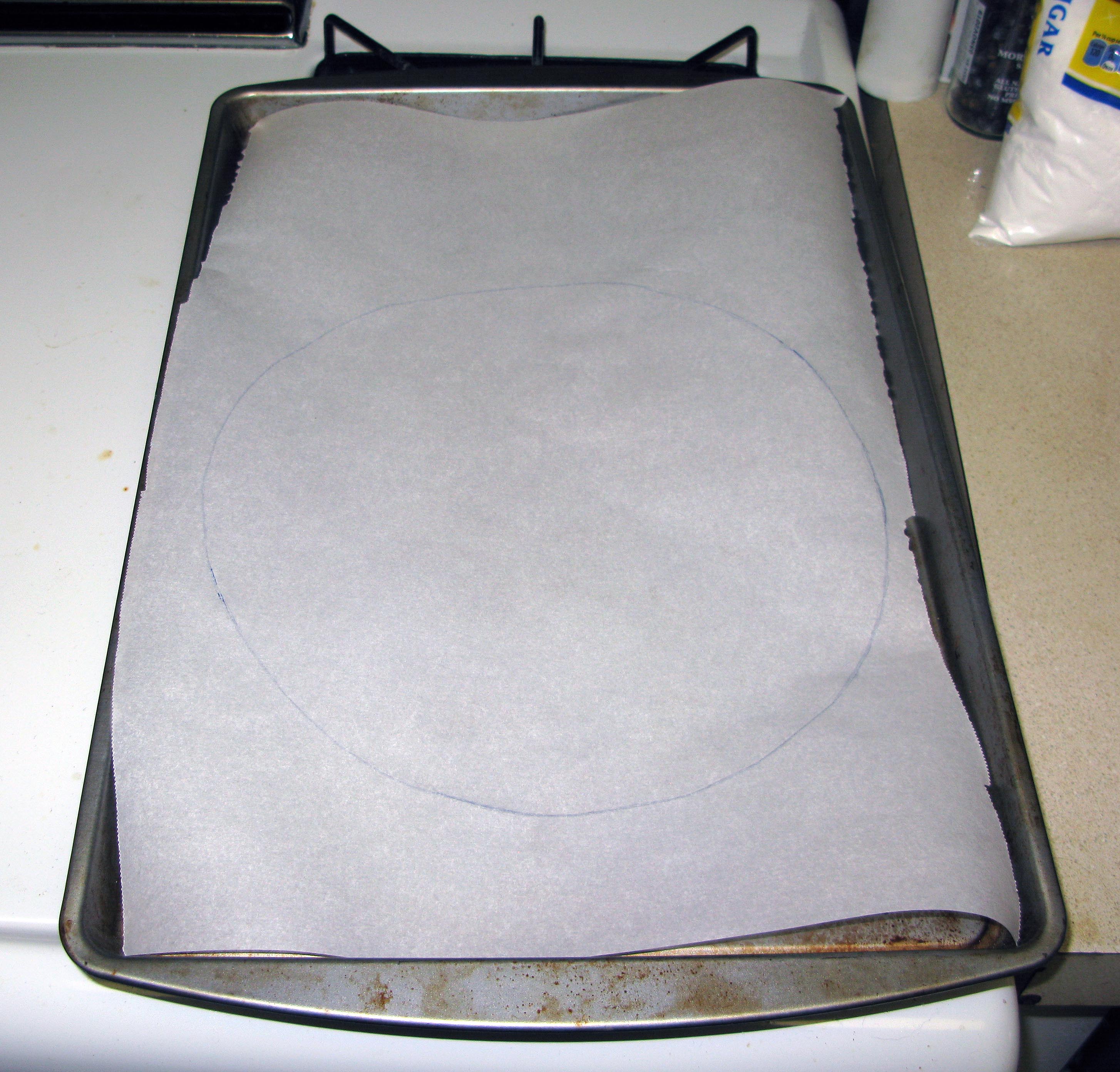 Draw a 9″ diameter circle on a piece of parchment paper. I did this by tracing a 9″ cake pan.