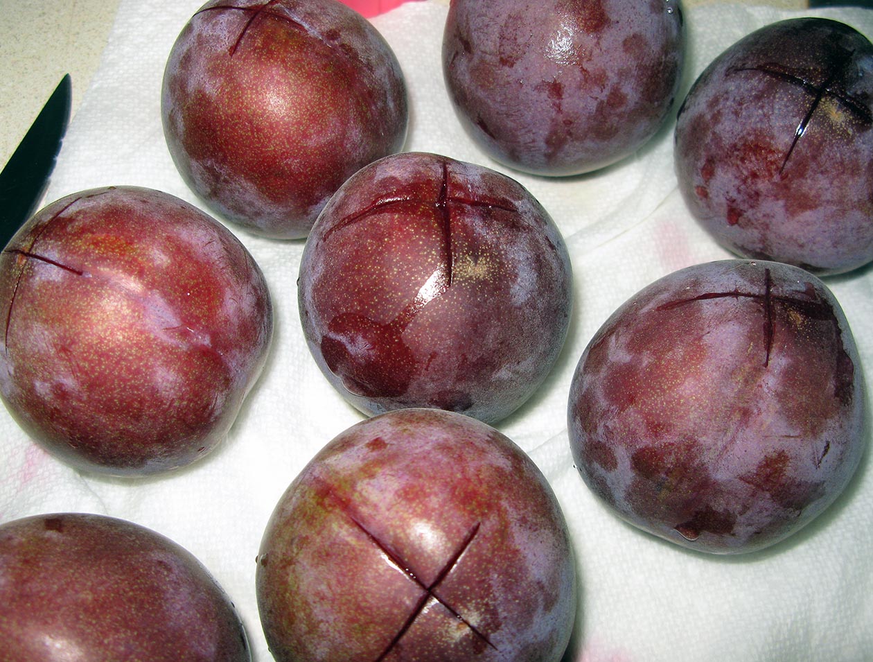 Let the apriums sit in the cold water until they are fully-cooled. You can start peeling them when they’re cool enough to handle, but I found that the skins came off easier if they’d had more time to cool (it also helped if they were a little softer to begin with). Either way, use the x you cut in the bottom of each aprium as a starting place and peel that skin off, using a knife to help you out if you get stuck.